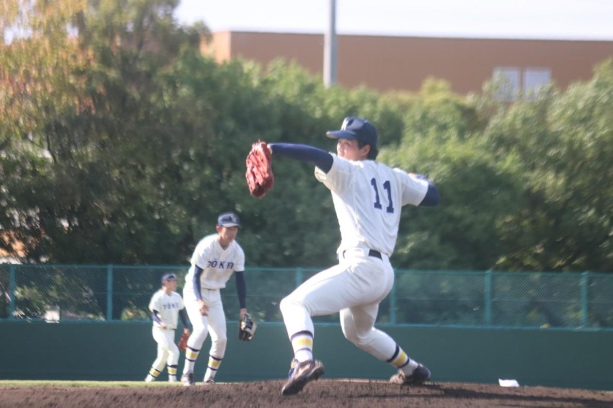 8回被安打4の好投を見せた先発・的野投手(4年)