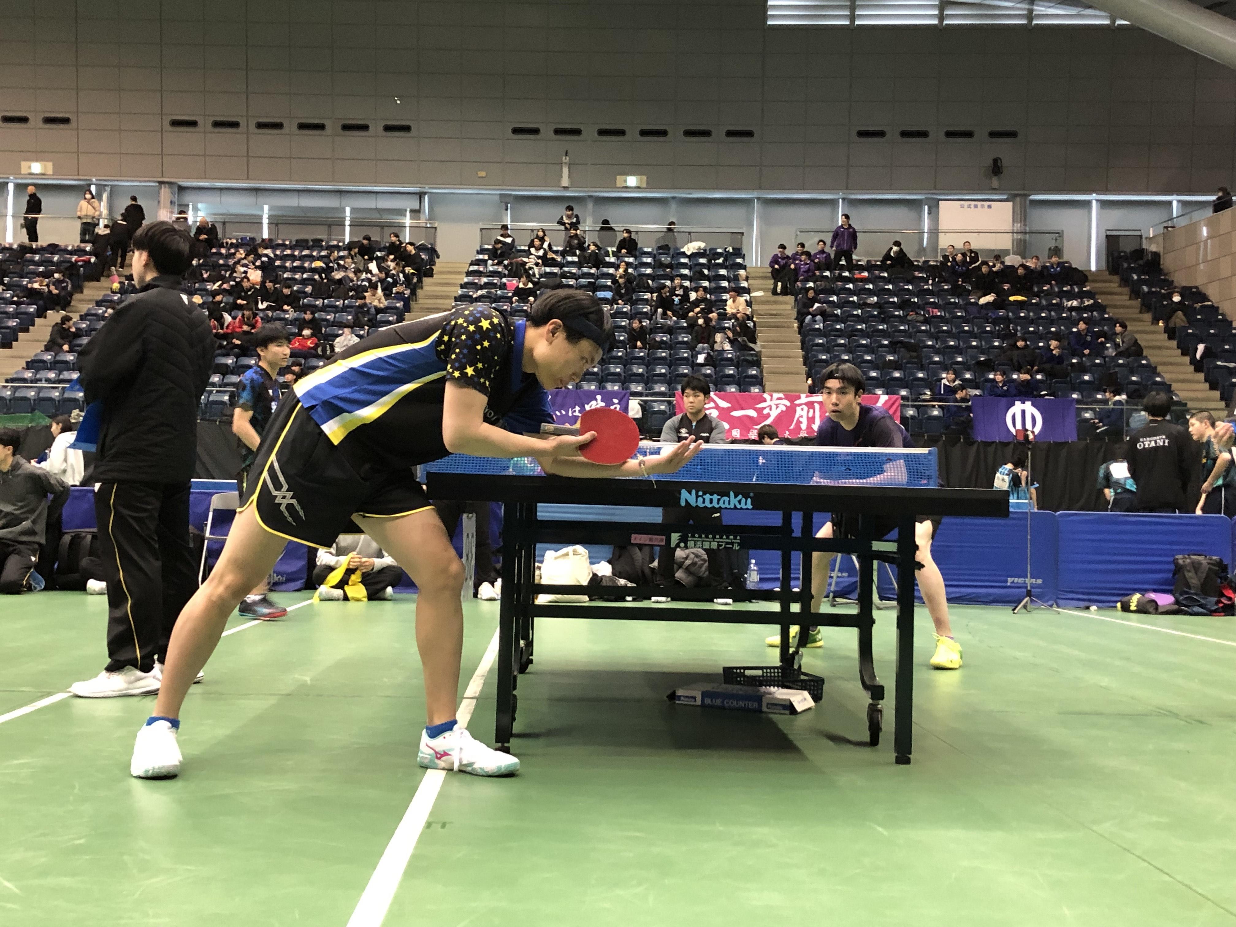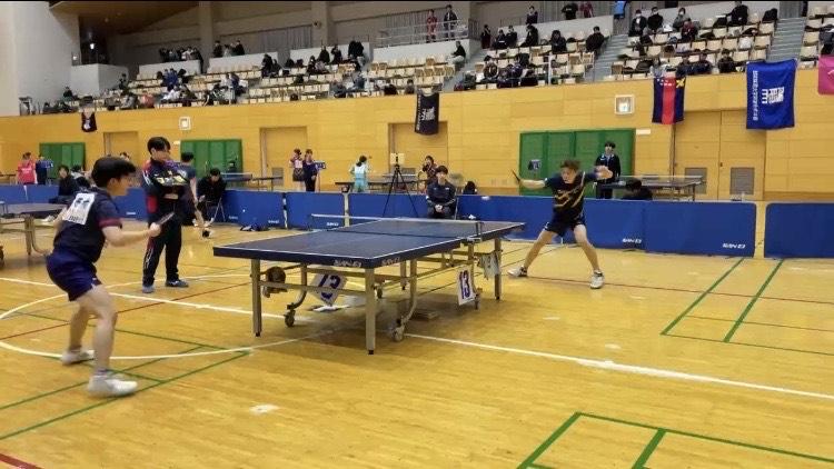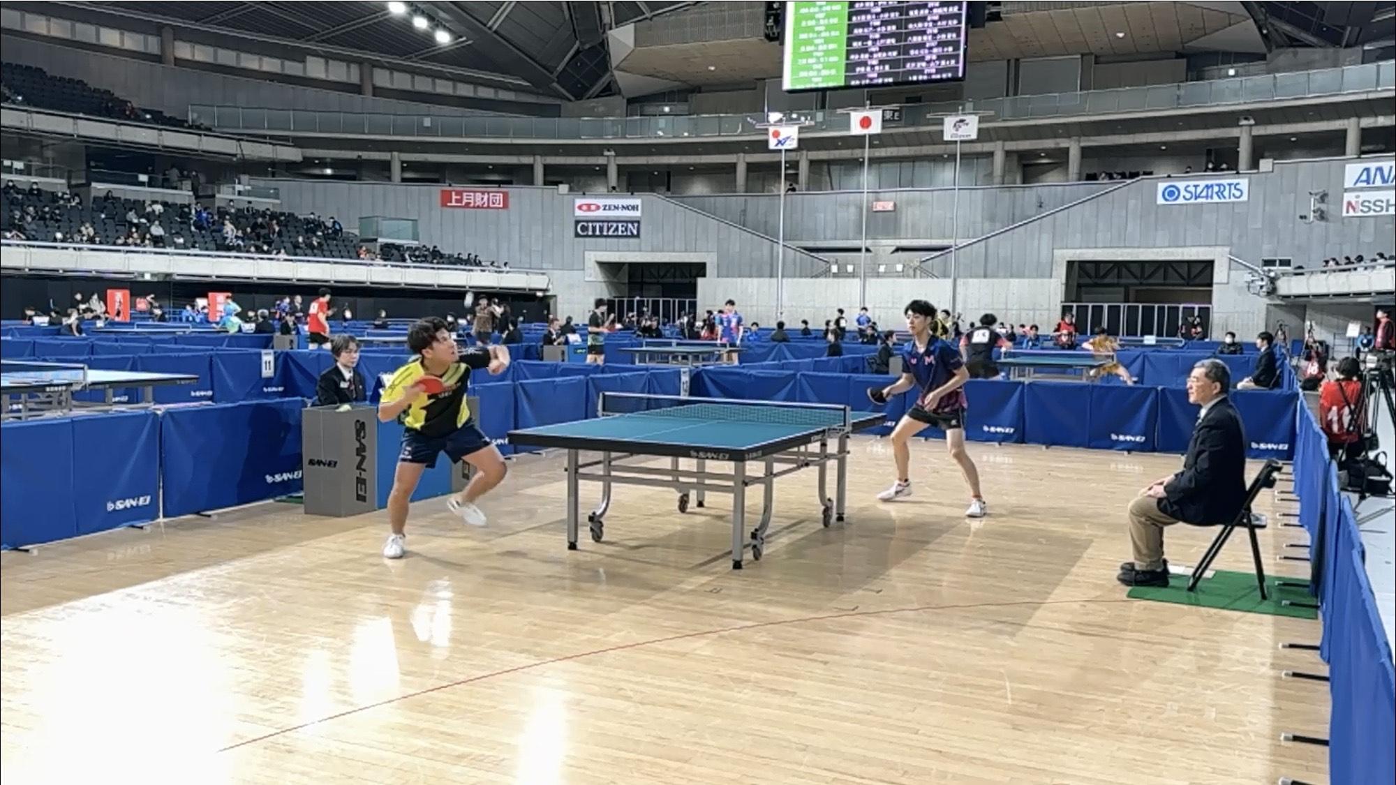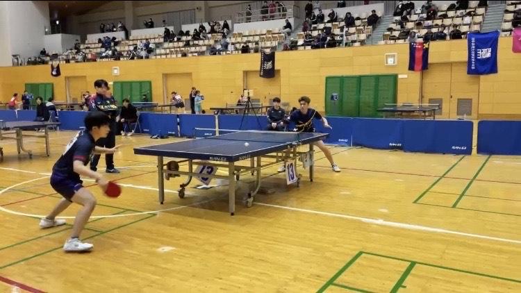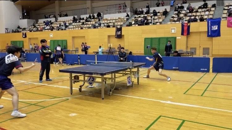 ダブルスは初戦で、本山惺也/鈴木恵大ペアが朝日大学(岐阜)のペアに0-3で、香坂海斗/原田尚輝ペアが関西学院大学(兵庫)のペアに1-3でそれぞれ敗北。香坂/原田ペアは3・4セット目にはデュースに縺れ込み、遊学館・愛工大名電出身の強豪相手に互角に渡り合いました。チャレンジャー精神溢れる“アツい”試合を展開しました。本山/鈴木ペアもストレートではあるものの、鈴木の前陣の素早いドライブや本山の強烈な攻撃など、息をのむ場面が多くありました。