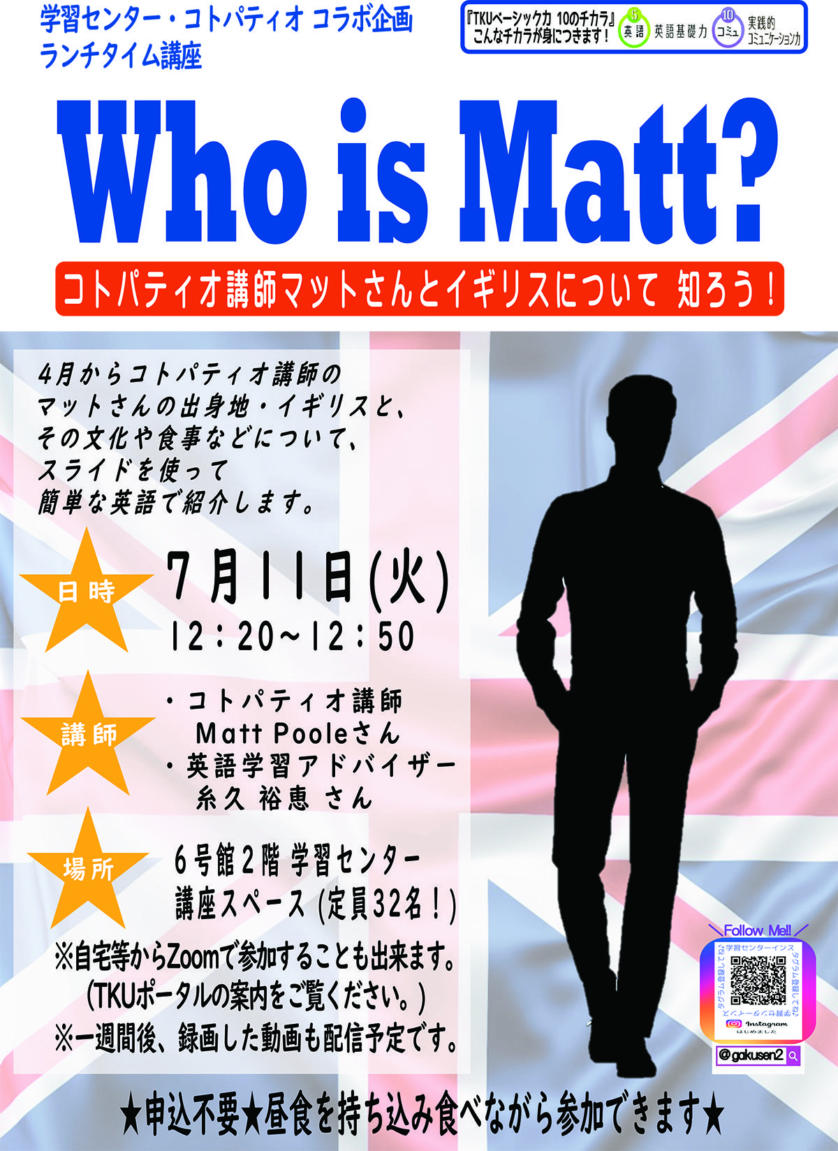 コトパティオ・学習センターコラボ企画 Who is Matt?7月11日(火)12:20~12:50