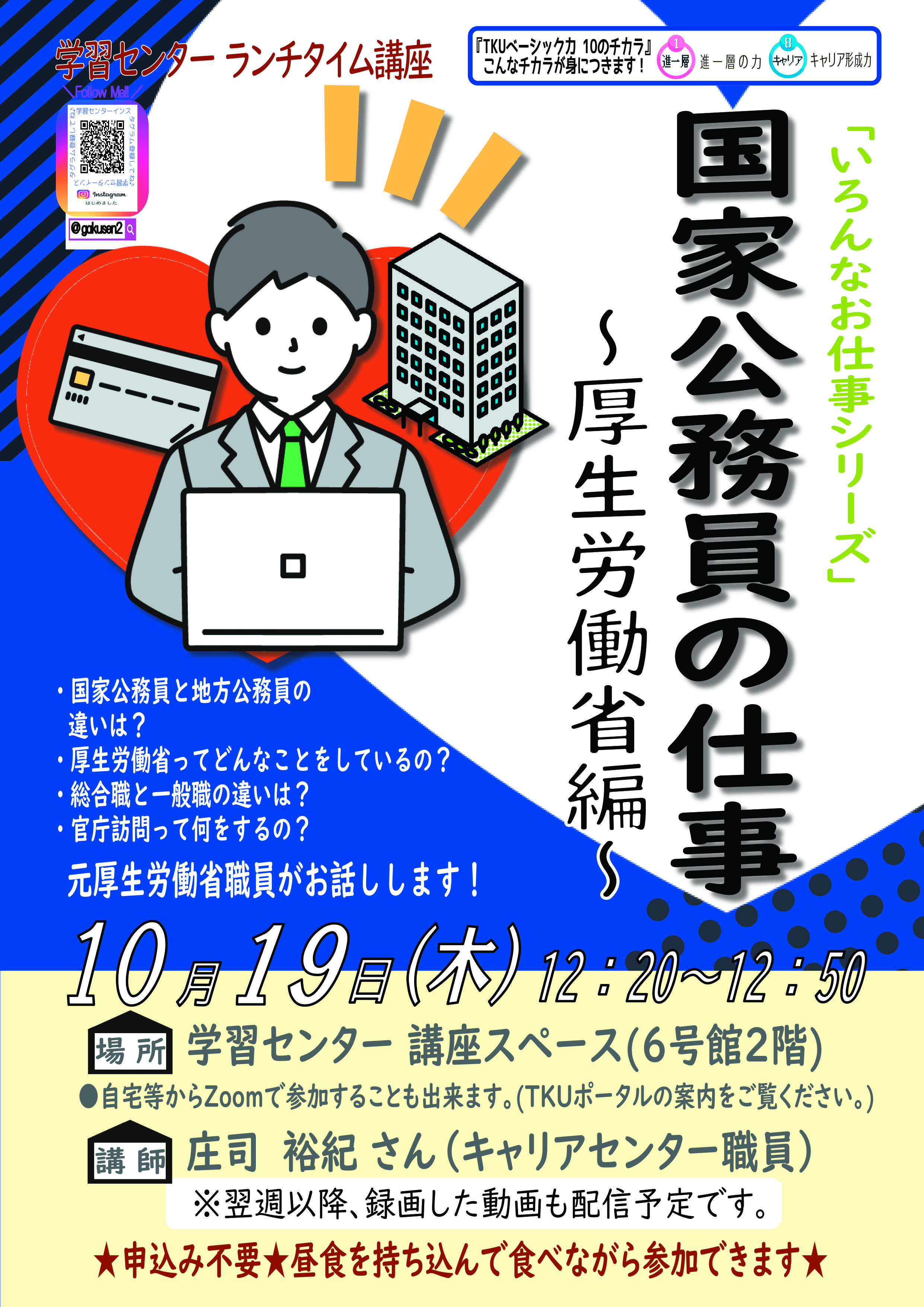 国家公務員の仕事~厚生労働省編~10月19日(木)12:20~12:506号館2階学習センター講座スペース/Zoom