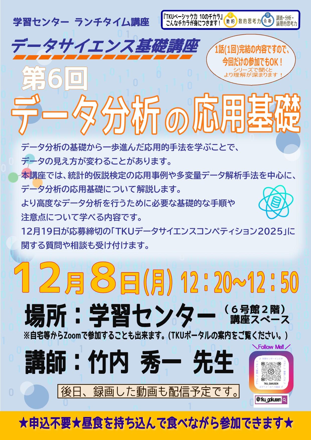 ①データサイエンス基礎講座 第6回「データ分析の応用基礎」・12月8日(月)12:20~12:50・6号館2階学習センター講座スペース/Zoom