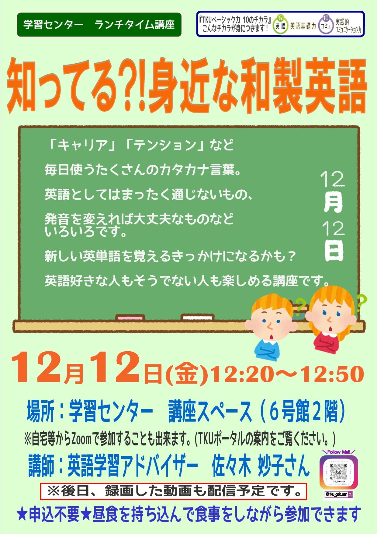 ③知ってる!?身近な和製英語・12月12日(金)12:20~12:50・6号館2階学習センター講座スペース/Zoom