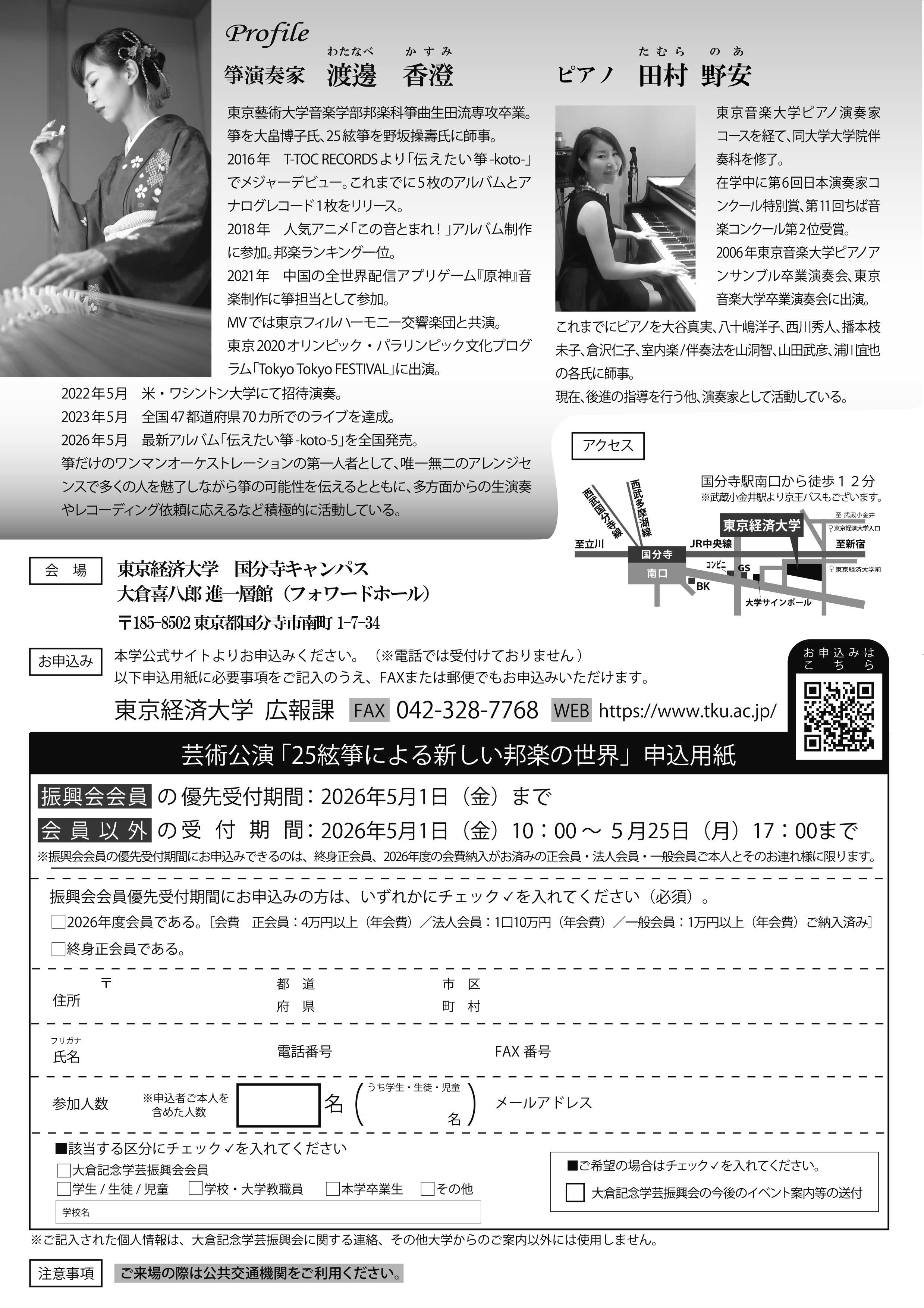 | 申込受付期間 | 大倉記念学芸振興会会員の優先受付期間:2026年5月1日(金)まで ※お申込み対象者は終身正会員、2026年度の会費納入がお済みの正会員・法人会員・一般会員ご本人とお連れ様になります。 ※会員優先受付期間内の、会員以外のお申込は無効とさせて頂きます。 会員以外の受付期間:2026年5月1日(金)10:00~5月25日(月)17:00 ※受付開始時間になりましたら、下部に設置されます「お申込みはこちら」より受付画面に進むことができます。 ※定員に達し次第、申込受付は終了となります。 |