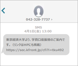 学費の引落通知として、以下のようなSMS(ショートメッセージ)が口座ご登録時の携帯電話番号宛に届きます。