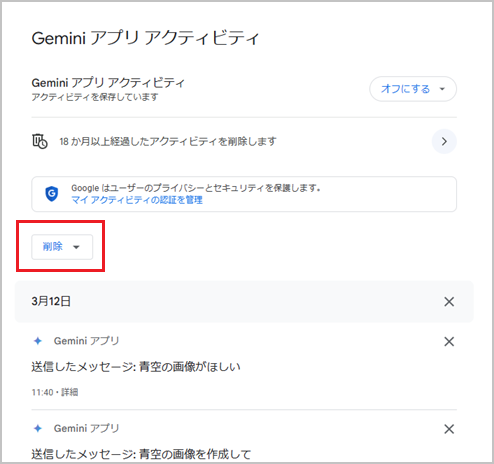 ●[Gemini アプリ アクティビティ] がオフになっている場合でも、会話は最長で 72 時間アカウントに保存されます。この期間は、Google がサービスを提供し、フィードバックを処理するために設けられています。このアクティビティはユーザーの [Gemini アプリ アクティビティ] には表示されません。