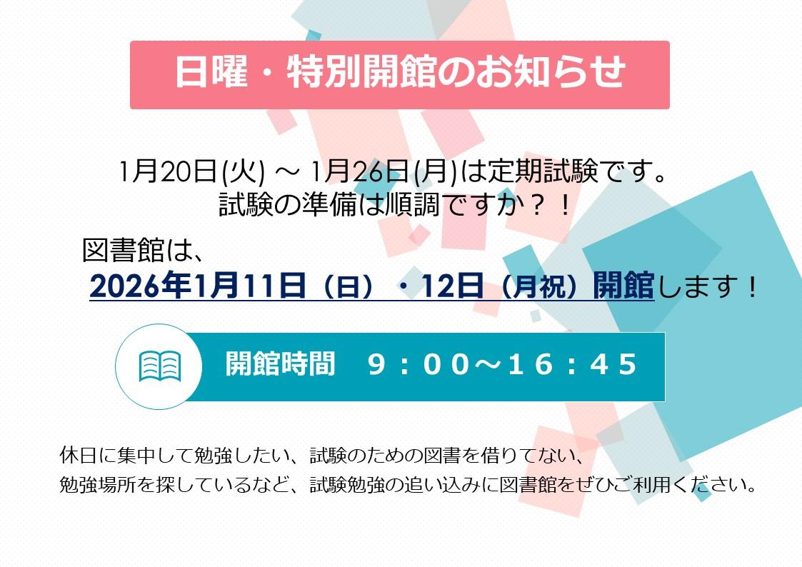 図書館は、2026年1月11日(日)・12日(月祝) 開館します。