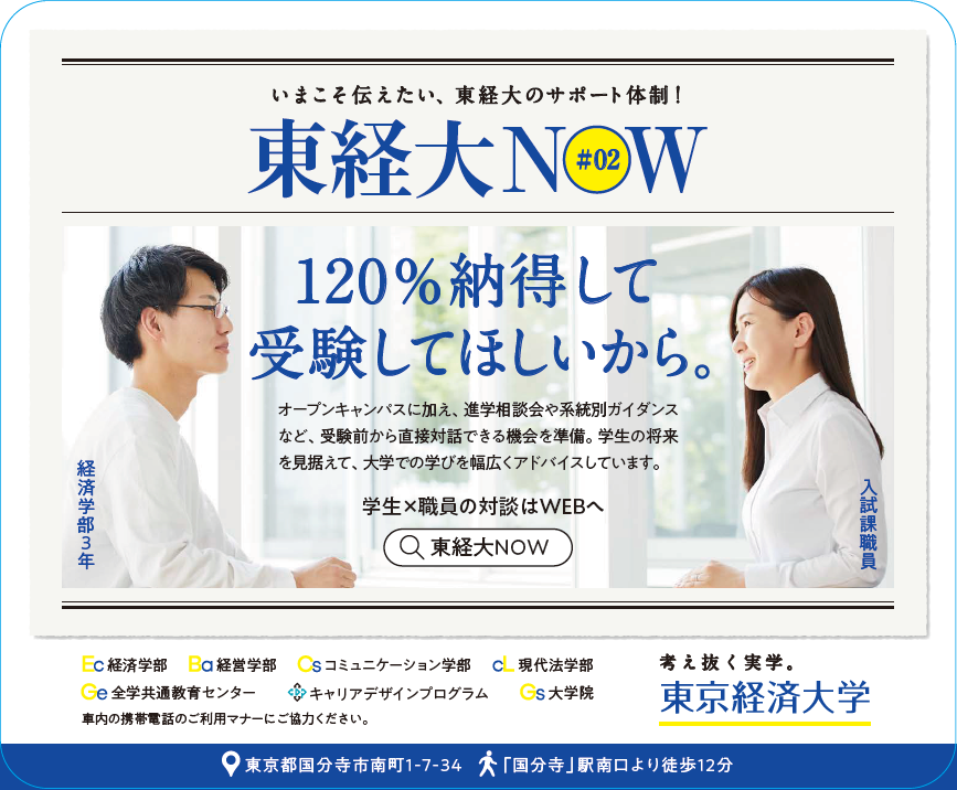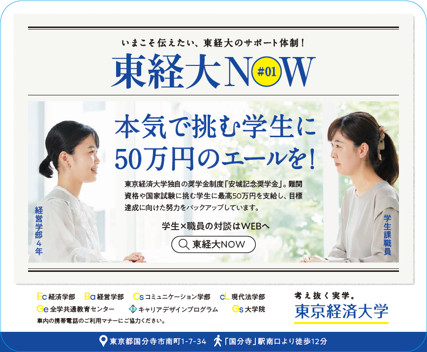 東京経済大学は、西武池袋線及び京成線の一部で「東経大NOW いまこそ伝えたい、東経大のサポート体制!」と題した広告シリーズを2022年8月から開始しました。