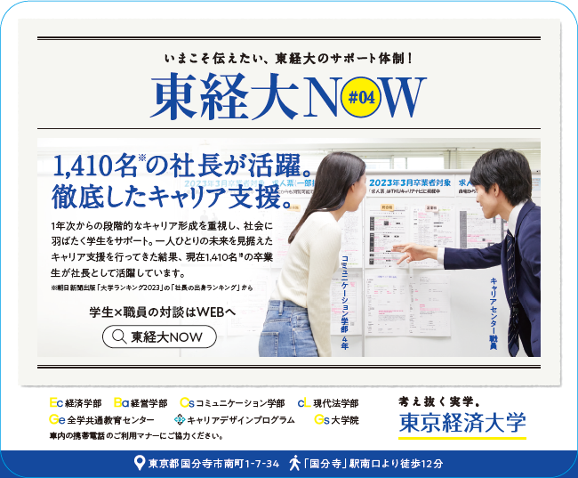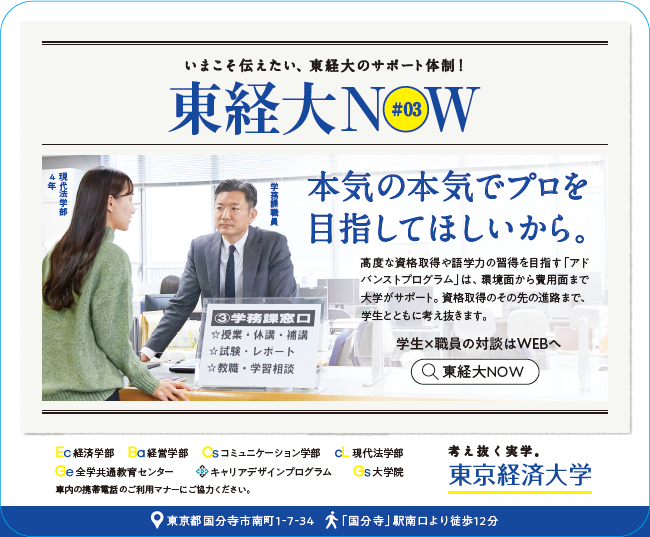 東京経済大学は、西武池袋線及び京成線の一部で展開する「東経大NOW いまこそ伝えたい、東経大のサポート体制!」と題した広告シリーズの第2回を2022年12月12日に更新しました。