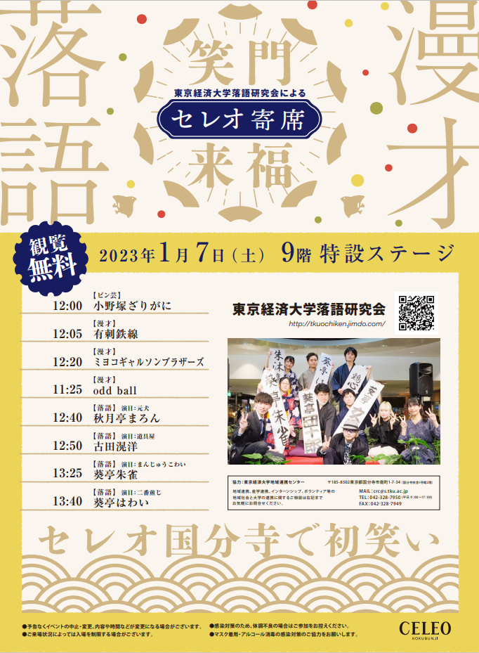 東京経済大学落語研究会は、2023年1月7日(土)正午より、JR中央線国分寺駅直結のセレオ国分寺の9階特設ステージで正月寄席を行い、漫才や落語で皆さまに2023年の初笑いをお届けします。