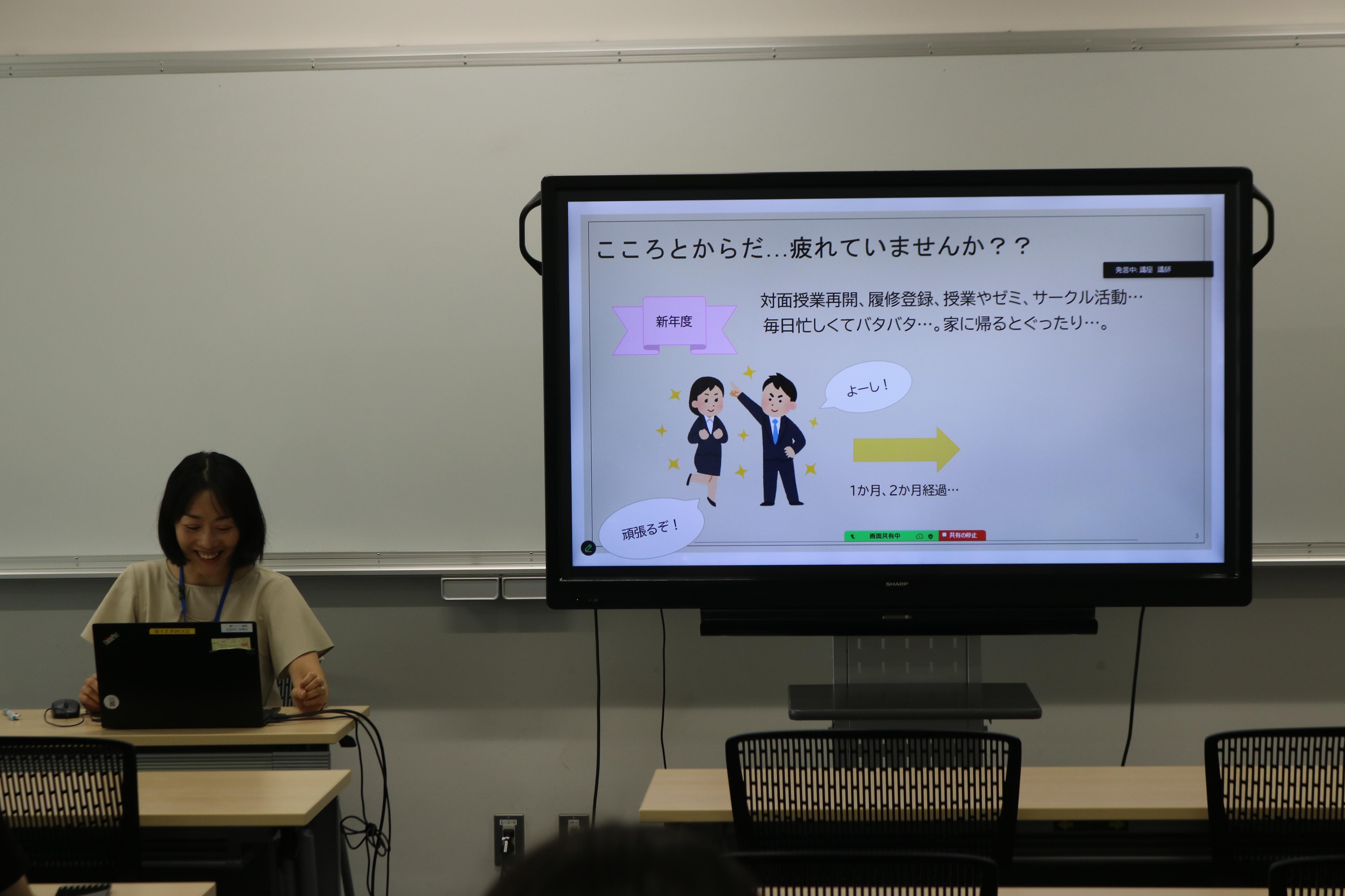 本講座は臨床心理士で学生相談室職員の川上華代氏が講師を務め、ストレスと抵抗力の関係性についてデータを用いて解説したり、リラックスするための簡単な運動を紹介したりしました。