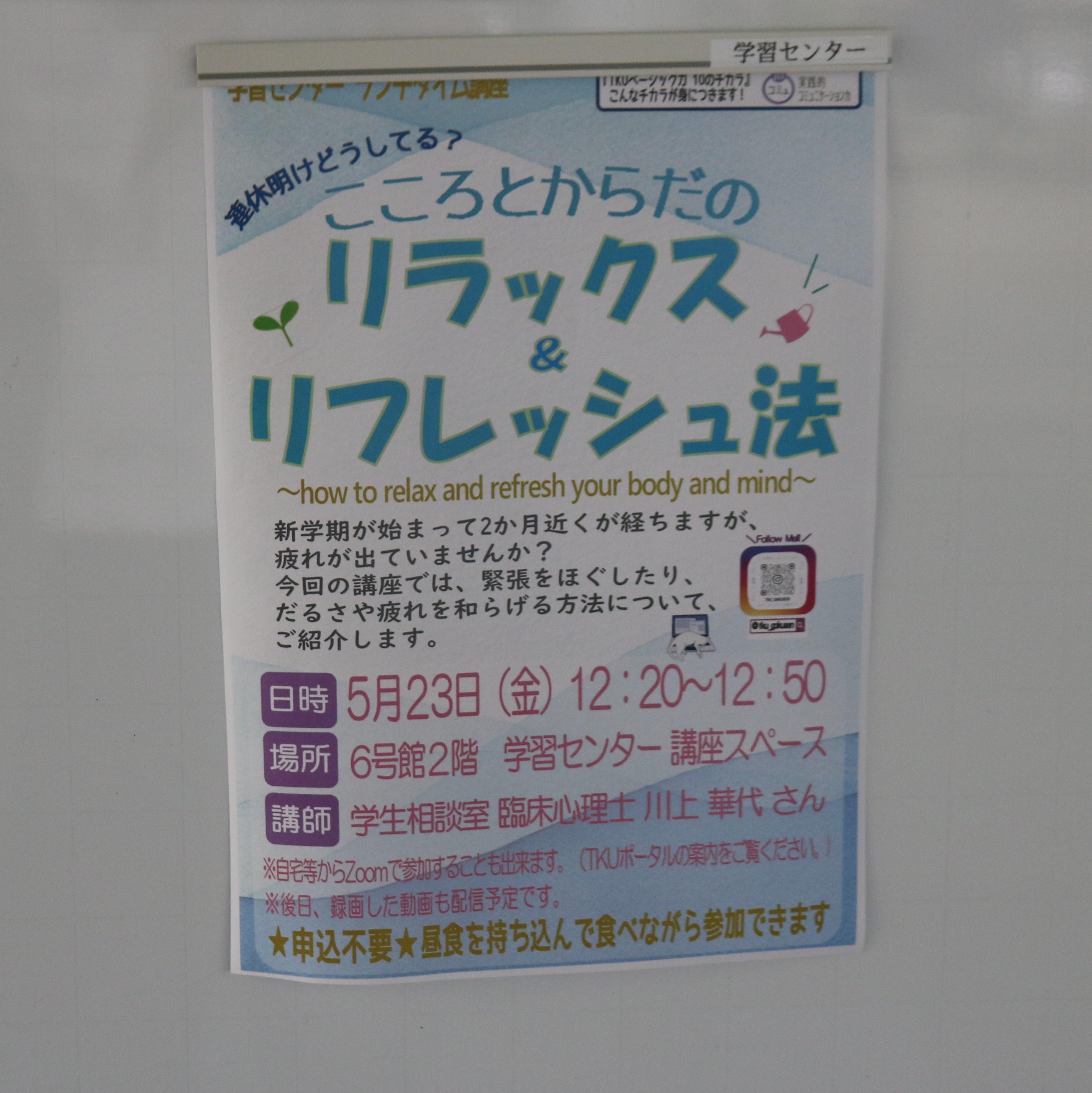 東京経済大学学習センターは2025年5月23日(金)、ランチタイム講座「こころとからだのリラックス&リフレッシュ法」を開催しました。