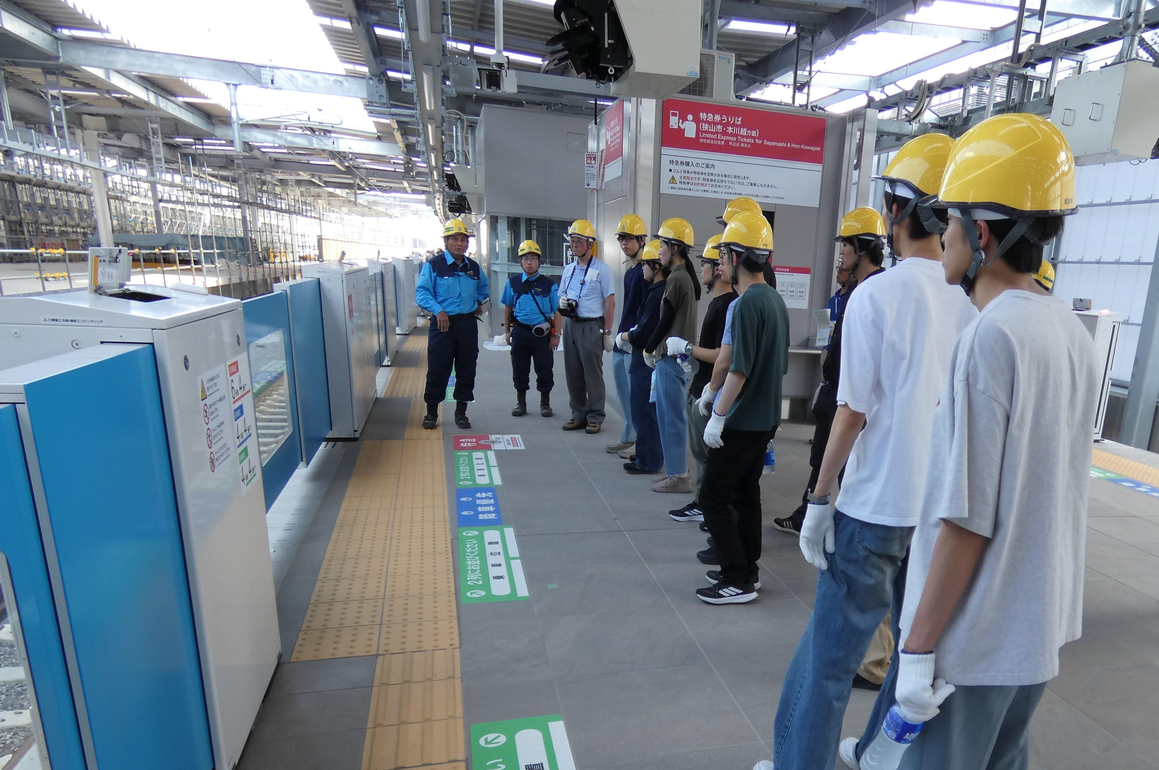 現場の見学では、ホームドアが一直線に設置されていないのは、様々な長さの列車の発着に対応するためであることや、駅部においては営業線の直上に高架橋を作る工法を採用しているため、ボルト1本の落下でも大事故につながる危険があることから、極めて慎重に工事が進められていること、また、日中の営業時間帯と終電から初電までの夜間わずかな時間の中で効率的に工事を進めるための工夫や沿線環境に配慮した設備や施工法などについて、実際の現場や実物を見ながら説明を受け、理解を深めました。