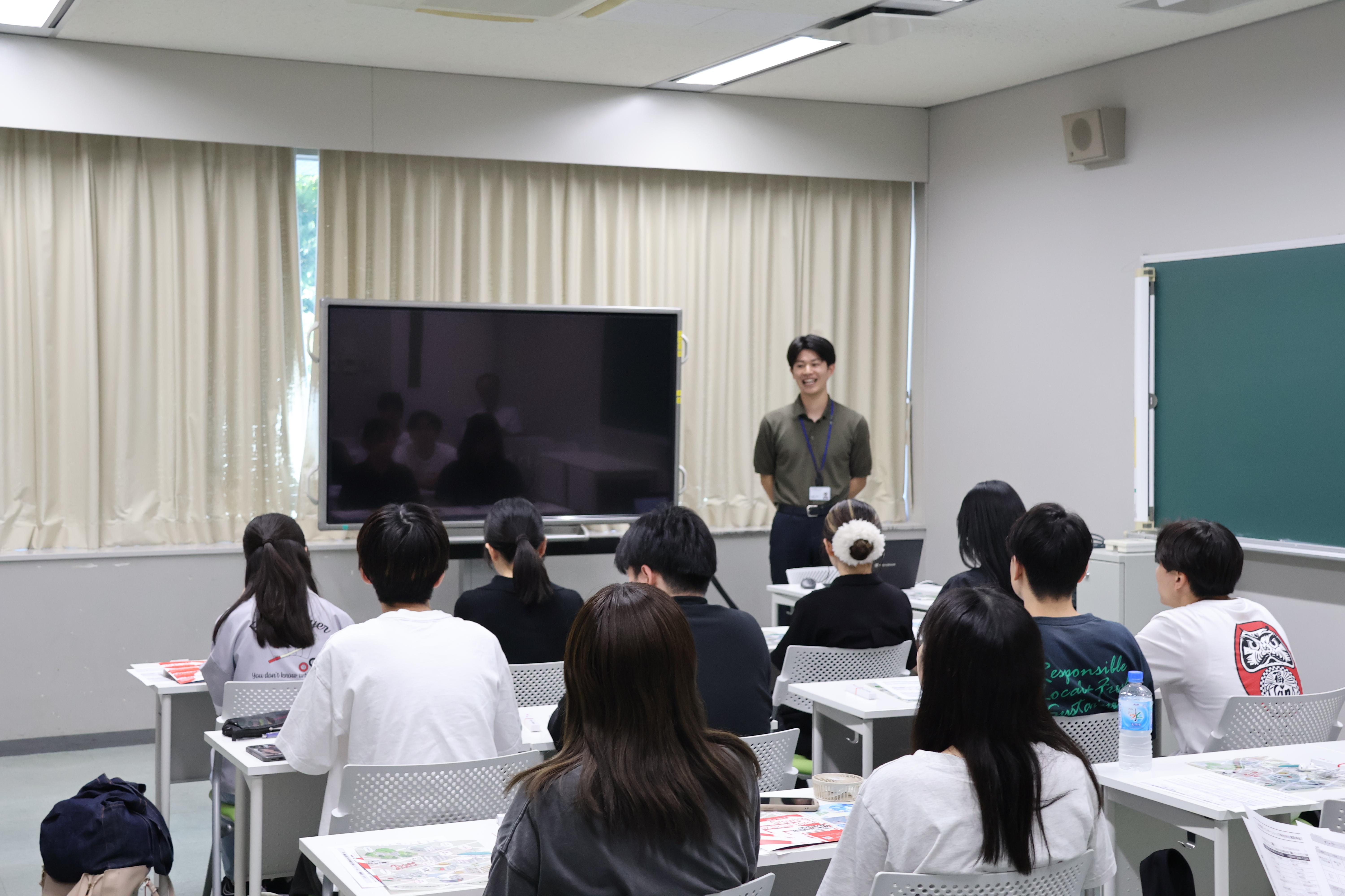 説明会は、各企業担当者による短いプレゼンテーションでスタートし、学生は企業の概要や魅力、インターンシップに関して解説を受けました。続いて、学生は教室に設置された企業ブースを訪問し、そこで担当者からより詳しく企業に関する情報提供を受けたほか、業務やインターンシップについて説明を受けるとともに、日ごろ疑問に思っていることを直接聞くことで、企業や業界、インターシップへの理解を深めていました。