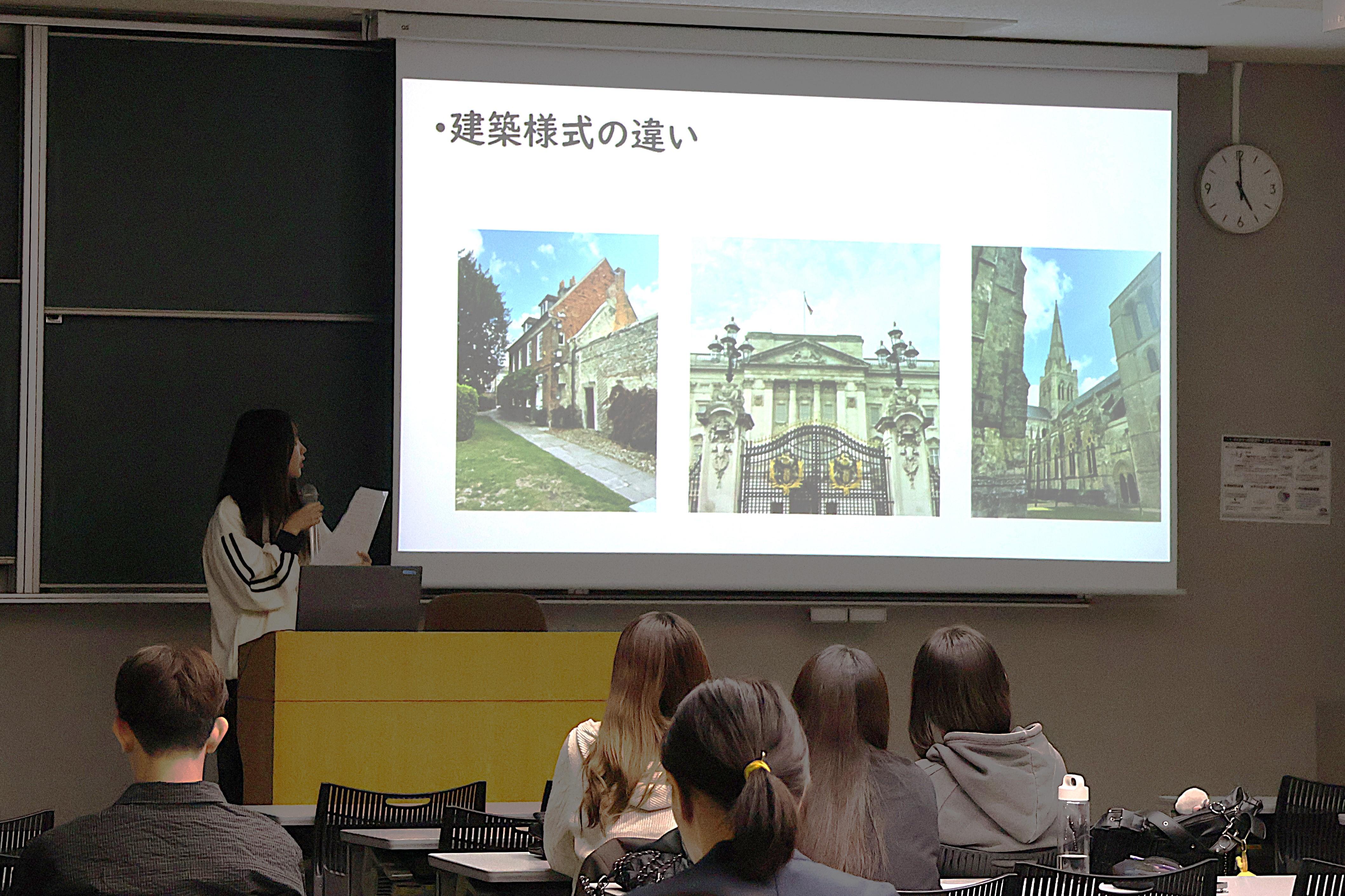 「日本とイギリスの違い」をテーマにした学生は、建築様式や食文化、それにごみの分別といった街並みに関する具体的な比較を行いました。また、多国籍国家であるイギリスに暮らす人々の多様性について、日本の文化的な背景を対比させながら、多面的に違いを明らかにしていました。