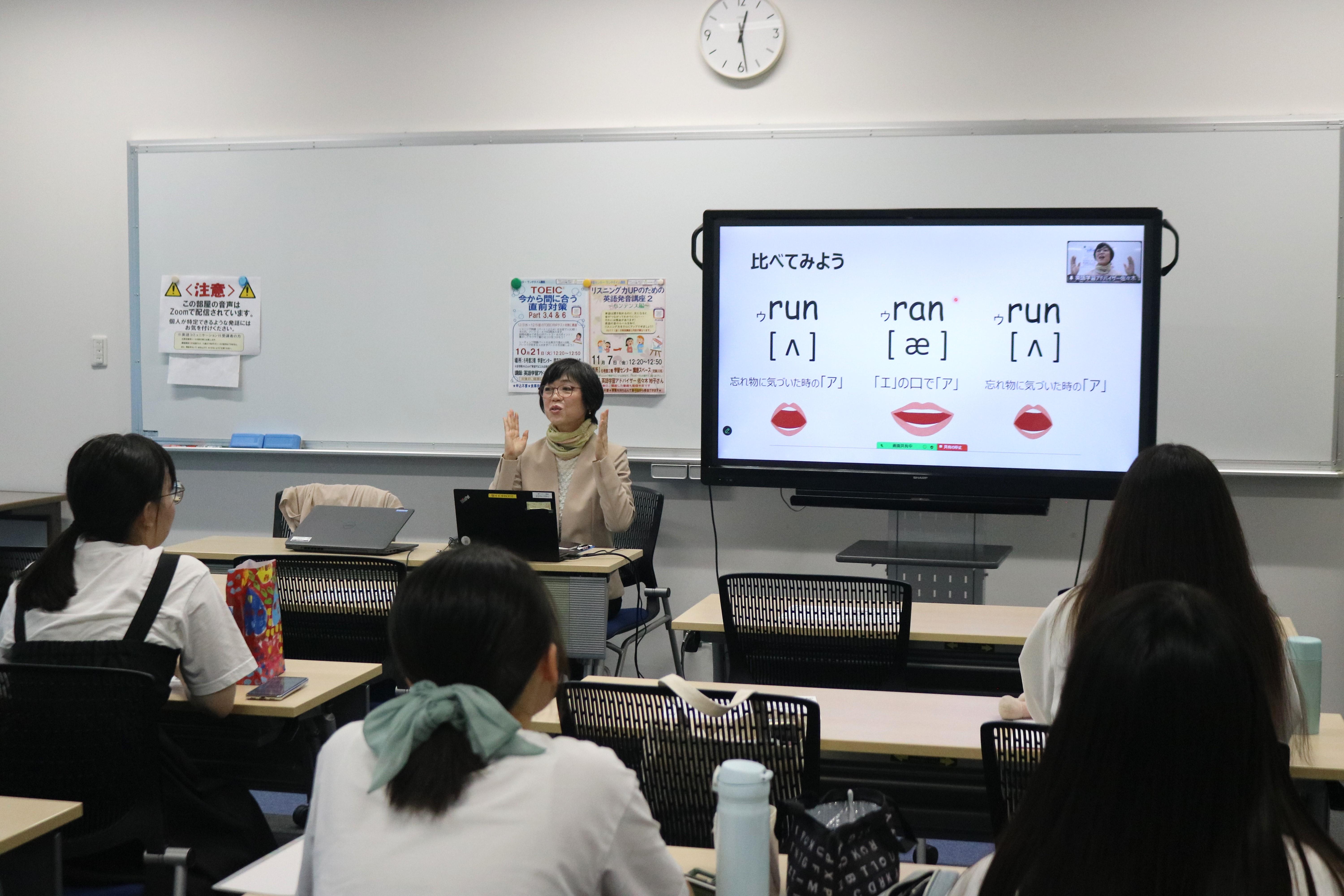 今回は、佐々木妙子英語学習アドバイザーを講師に迎え、学生が苦手意識を持ちやすい英語の発音について実践的な講義が行われました。
