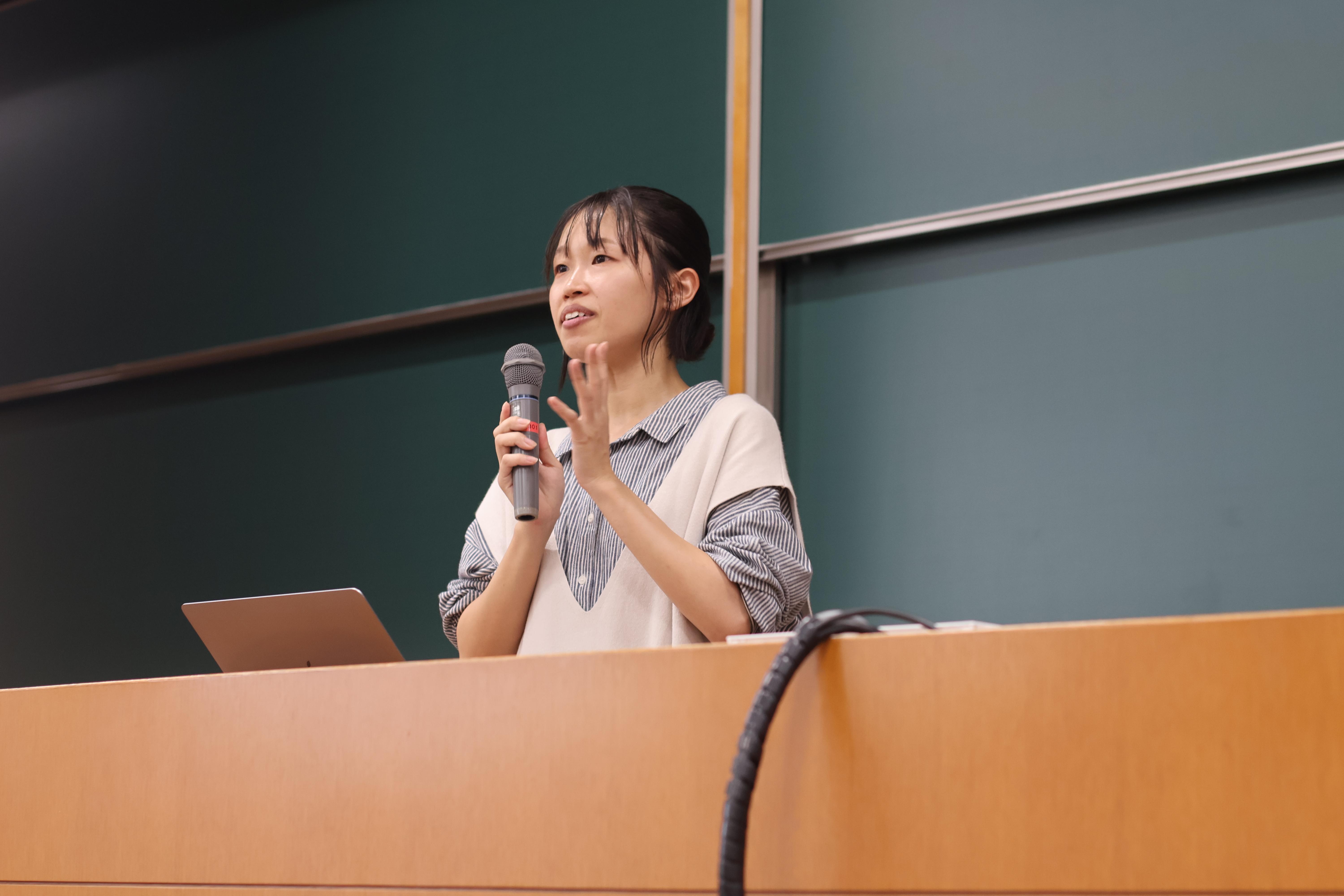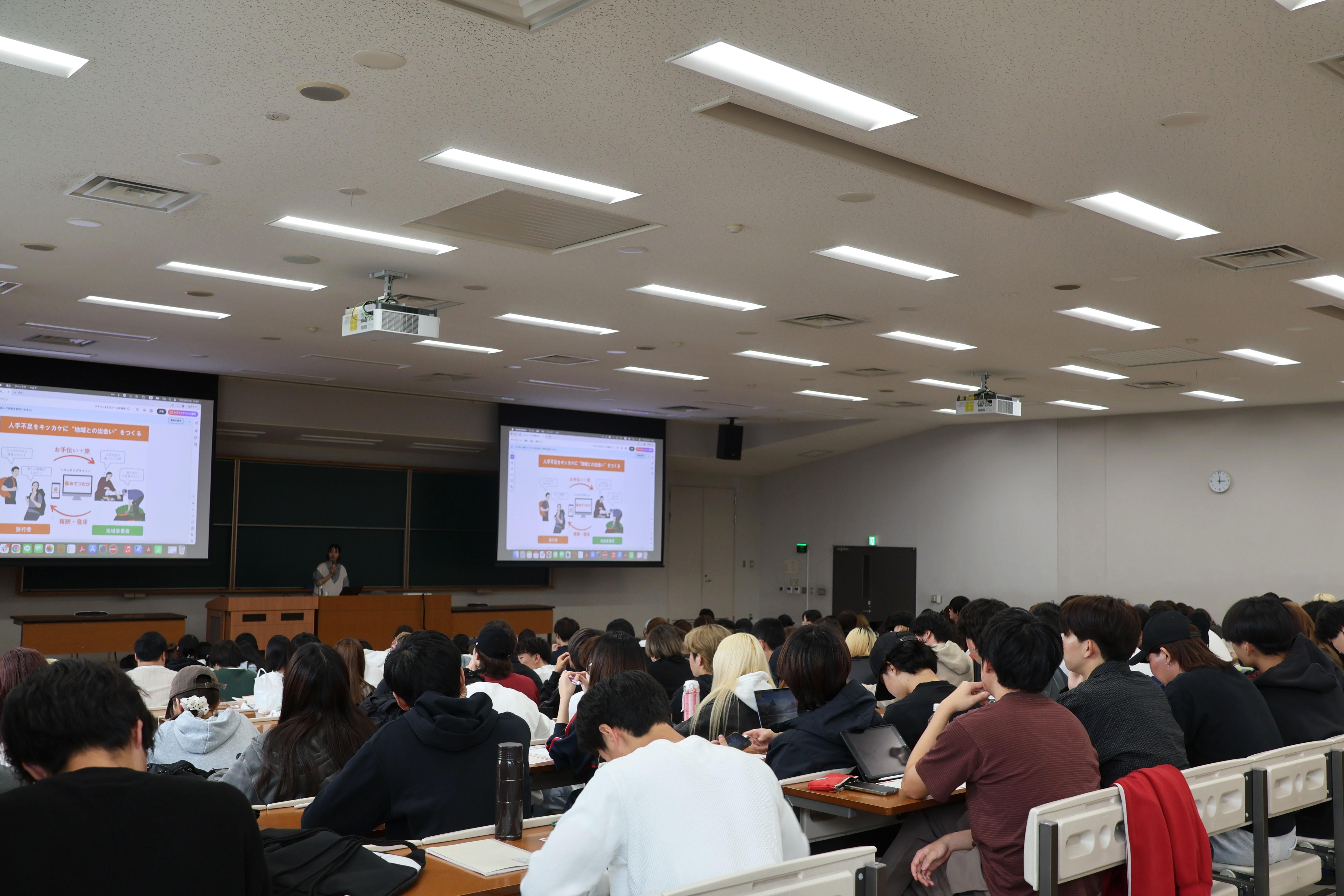 芳倉氏は講義で、「おてつたび」の多様な事例を紹介し、知らない地域に飛び込み、臆せずにコミュニケーションを取る経験が、多様な価値観への理解を深め、将来のキャリア形成に役立つと伝えました。国際交流や広報・PRといった多岐にわたる仕事に触れる機会があることも紹介し、「学び」を「経験」として実践することの重要性を強調しました。