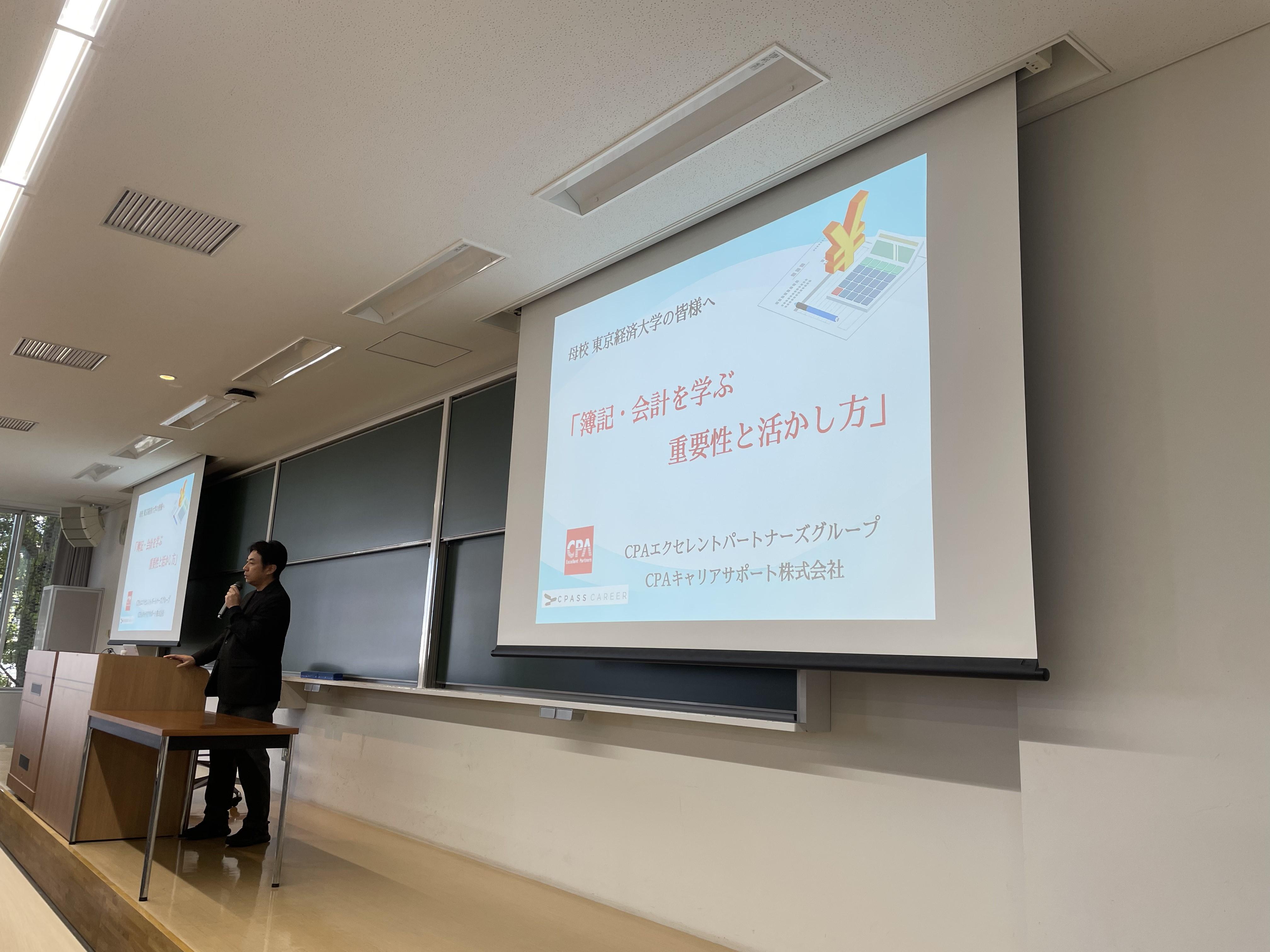 東京経済大学の授業の1つである「工業簿記」では、2025年10月28日(火)にCPAキャリアサポート株式会社取締役の駒井滋氏(本学経営学部1996年卒)を招き、「簿記・会計を学ぶ:重要性と活かし方」と題するゲスト講義を行いました。