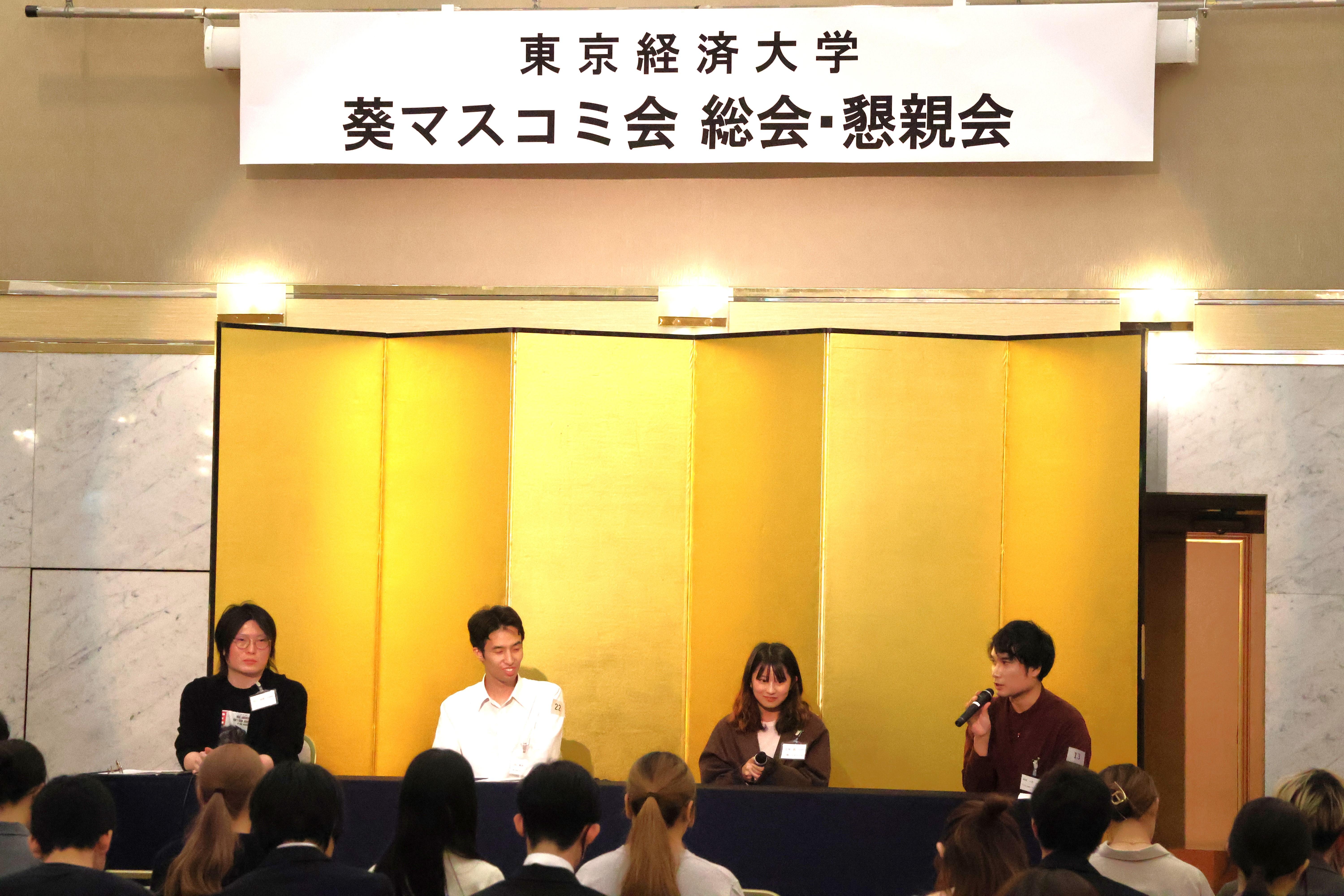 この日の葵マスコミ会は2部構成で行われ、第一部の「業界クロストーク」では、映像制作、広告、広報、ソーシャルメディアの各企業で勤務する卒業生4名が登壇し、事前に学生から寄せられた質問をもとに、業界の現状や仕事のやりがいなどをテーマにして座談会が行われ、参加した学生らは熱心に耳を傾けていました。
