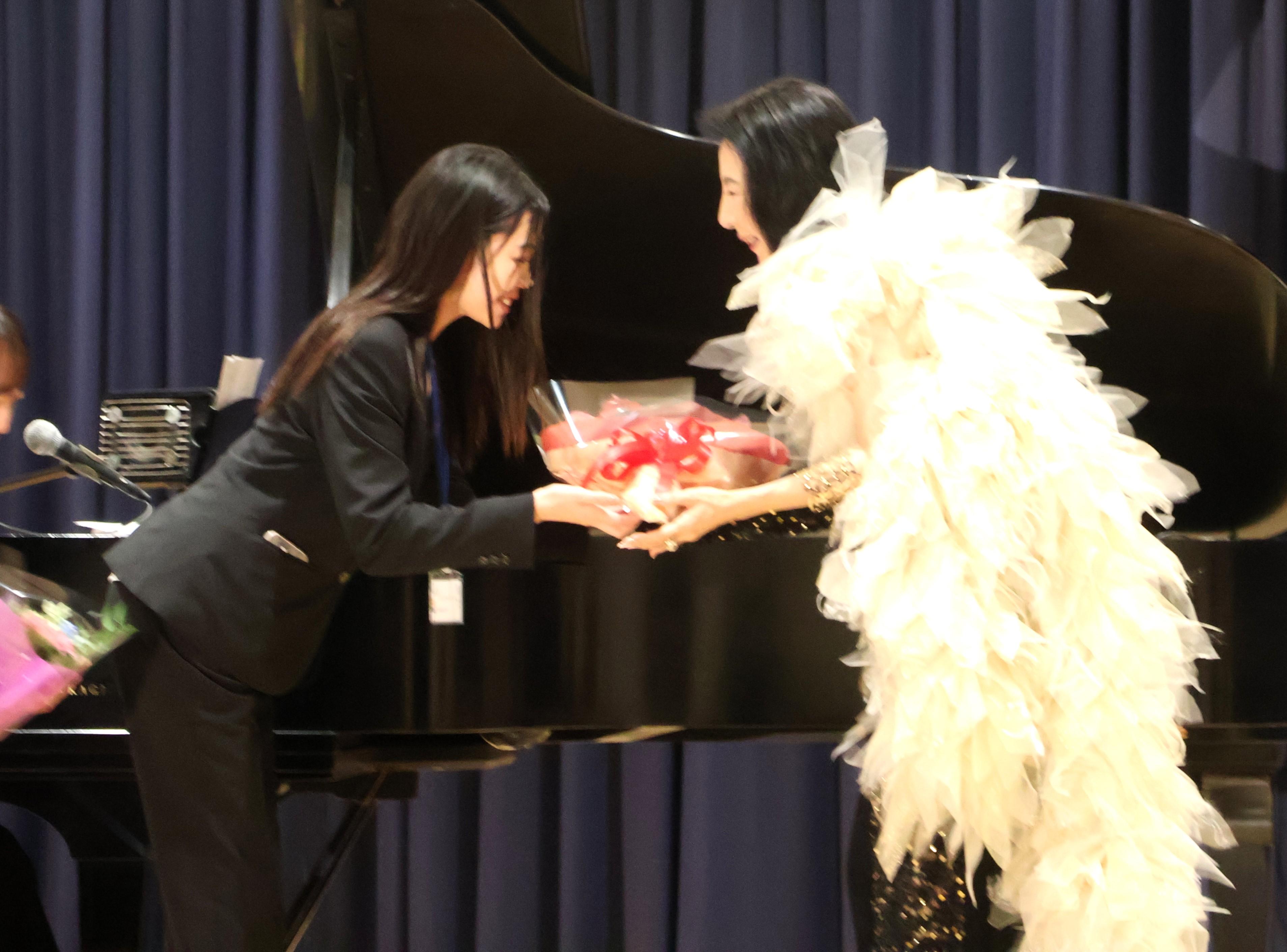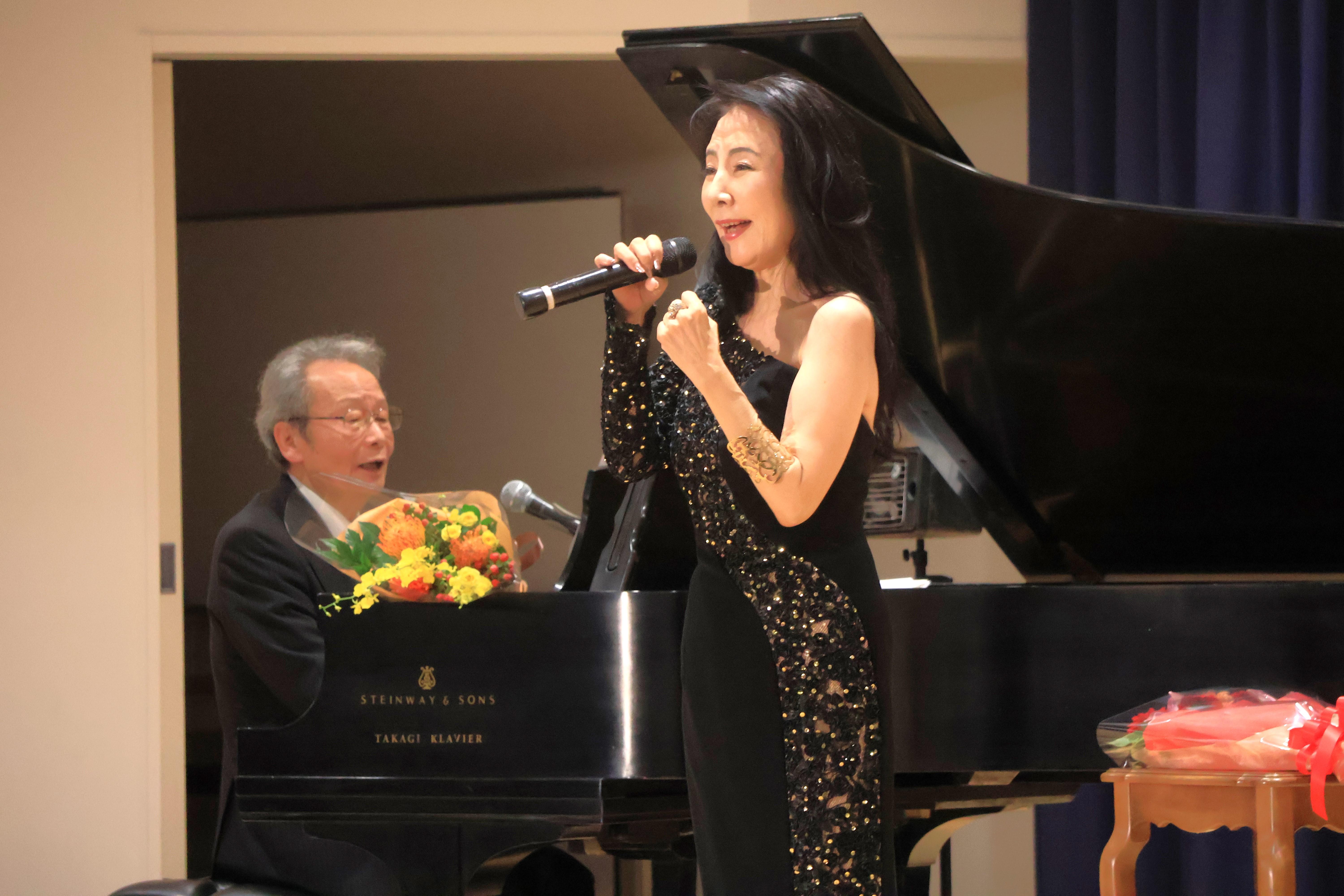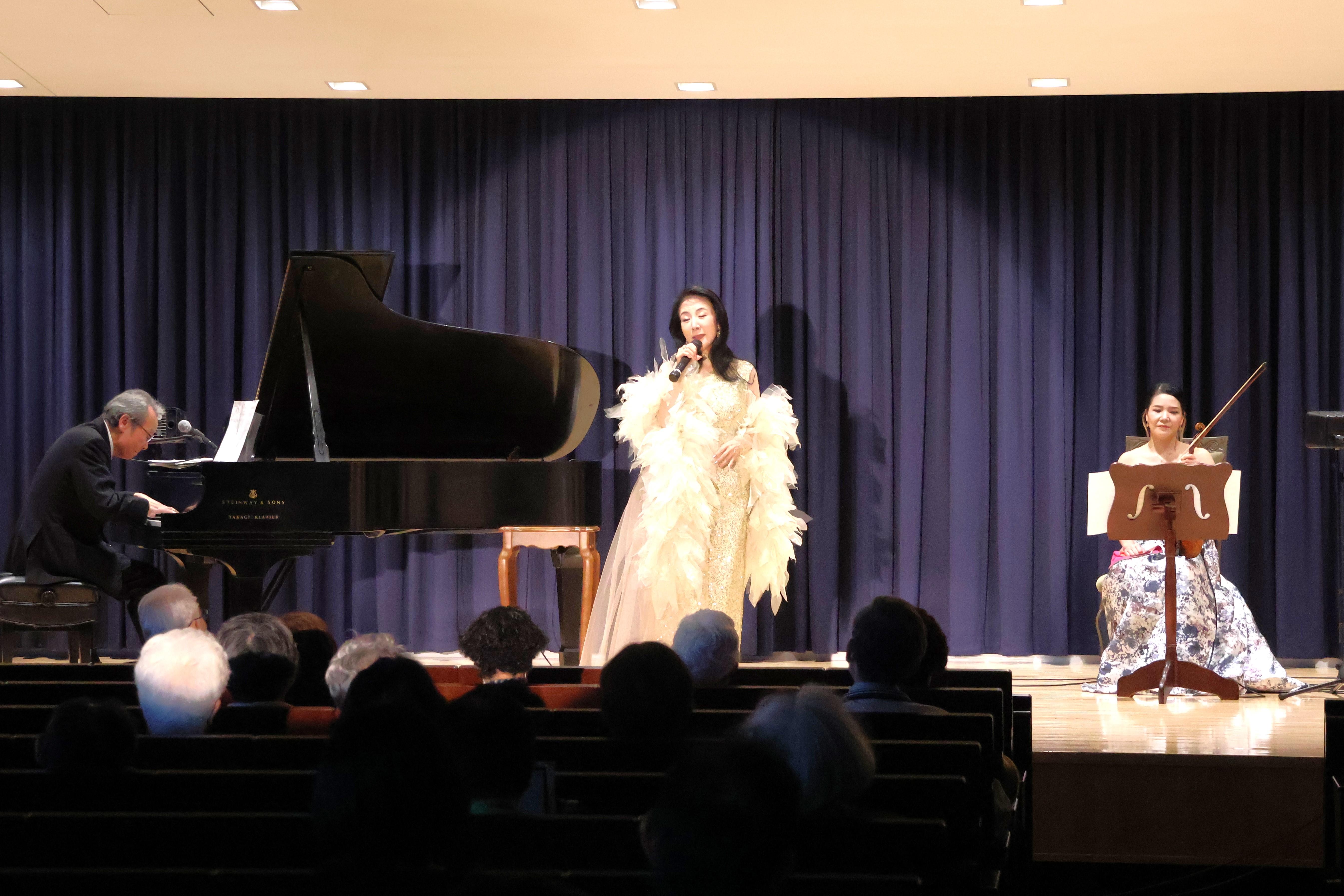 今回の芸術公演は、シャンソン歌手の友納あけみさん、ピアニストの小野政和さん、ヴァイオリニストの寺島貴恵さんが、全14曲の楽曲を演奏しました。
