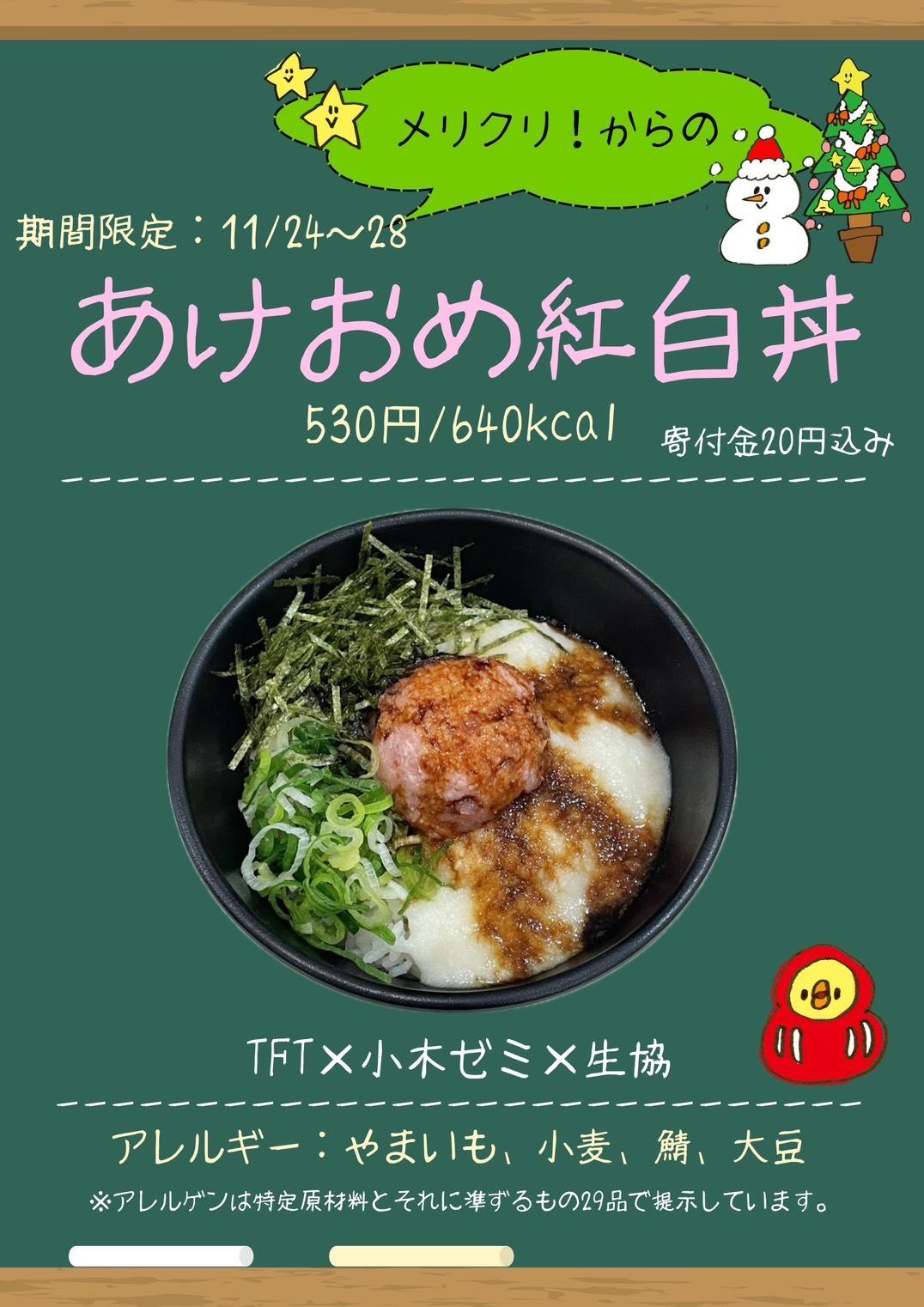 TFTとは「発展途上国の飢餓と先進国の肥満や生活習慣病を同時に解決する」という日本発祥のプログラムで、学生食堂でTFTランチを購入すると、一食ごとに、発展途上国の子どもたちの給食一食分に相当する20円を寄付することにしています。小木ゼミでは年2回、大学生協と共同でTFTランチの考案を行っています。