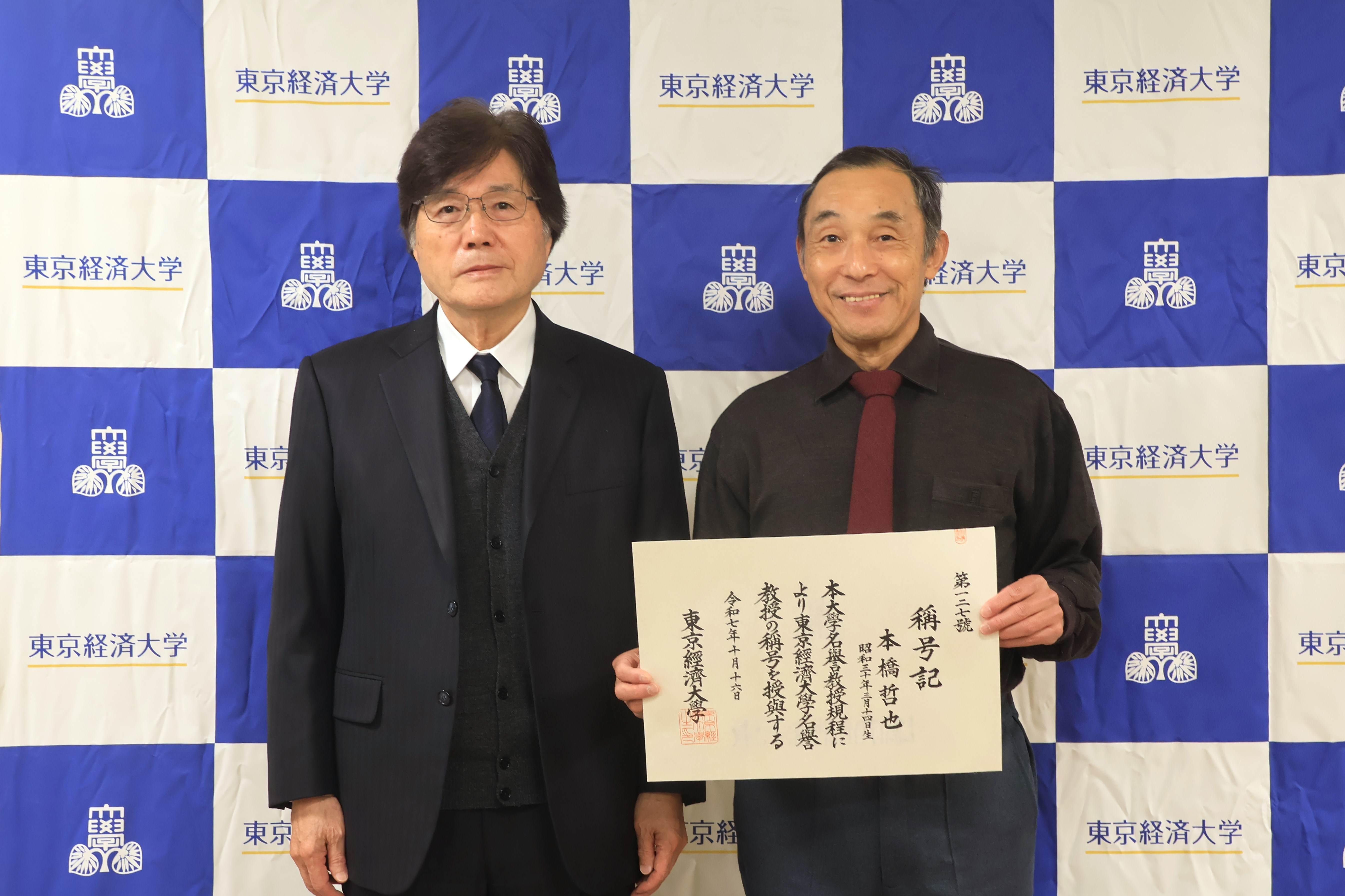 東京経済大学は、長きにわたり本学の教育・研究に多大な貢献をされた方を称えるため、名誉教授の称号授与式を2025年12月4日(木)に学長室にて執り行いました。