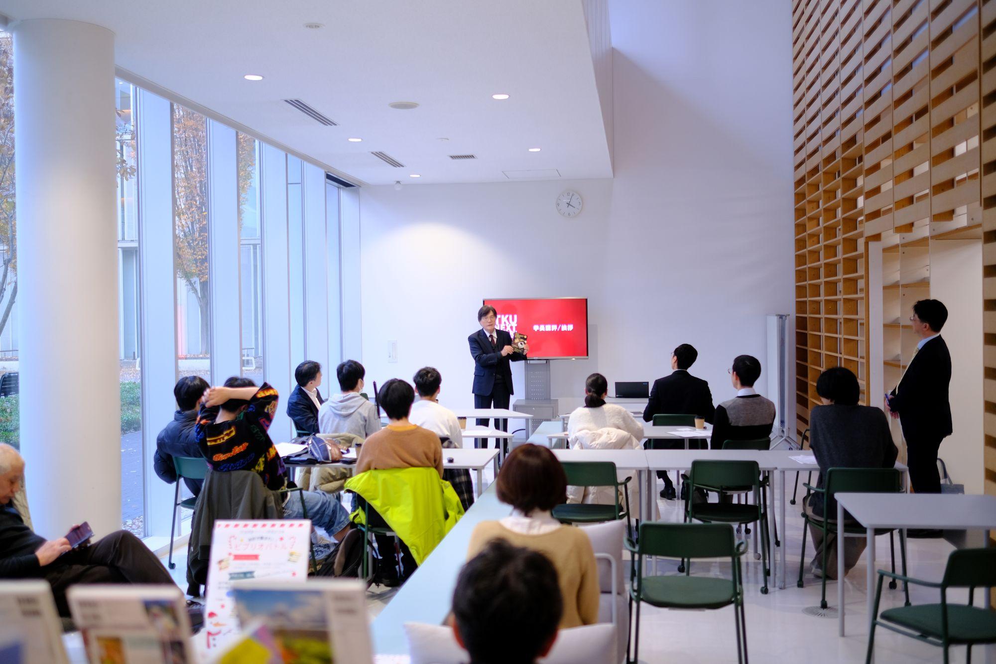 第7回目となる今回の「図書館まつり」は、「TKU NEXT LIBRARY COMPETITION 図書館の未来像を構想しよう!」と題して「これからの東経大図書館についてのアイデア」を事前に募集、当日は応募者が自らのアイデアを発表し、その場で学長や図書館長による選考を経て、表彰を行いました。