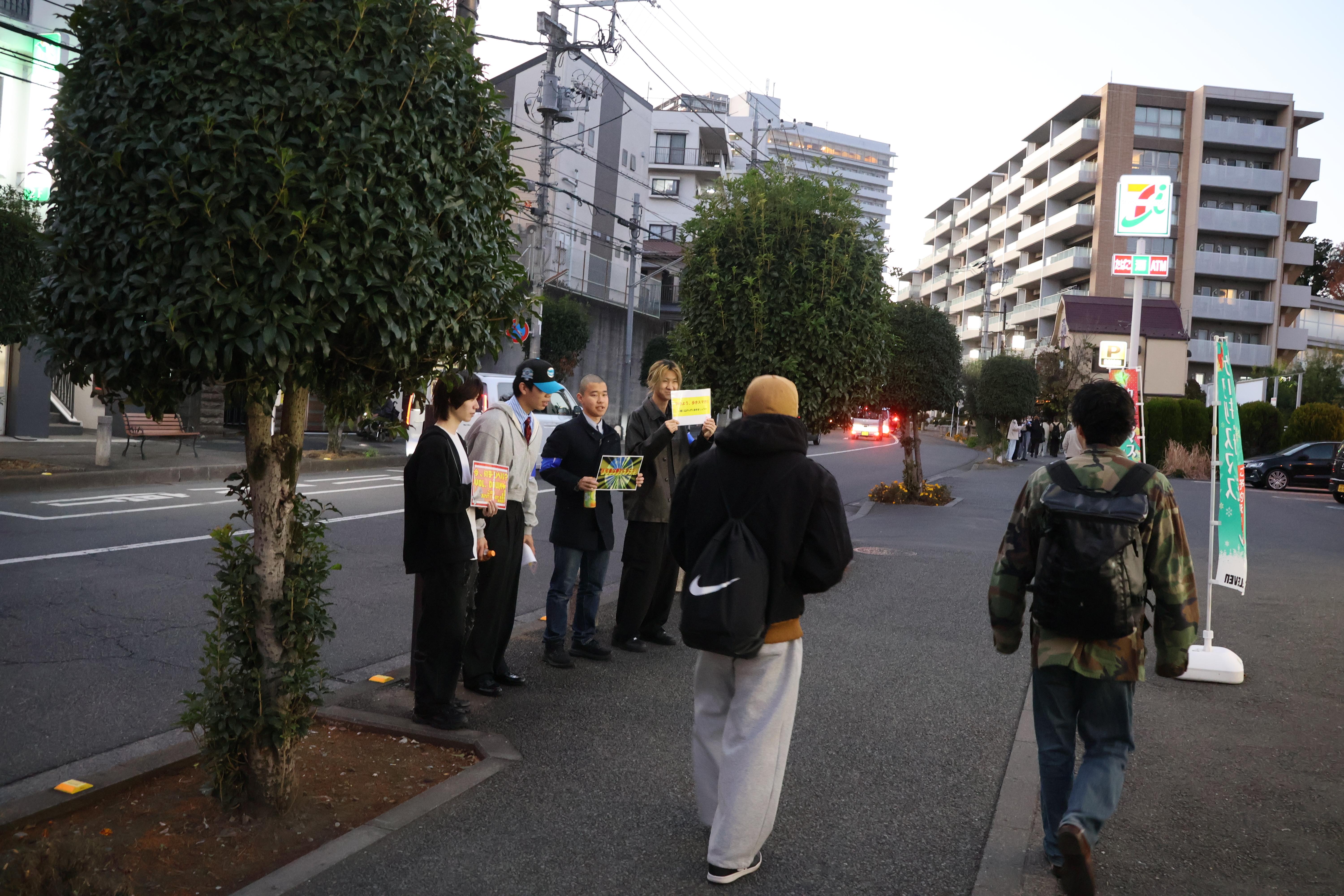 当日は、キャンパスから国分寺駅までの通学路の間で「声は控えめに」「広がらないで」「周りへの配慮を」などのメッセージが書かれた手作りのプラカードを使った呼びかけや、清掃活動を実施しました。活動中には近隣住民の方にあたたかい声をかけられる場面もありました。