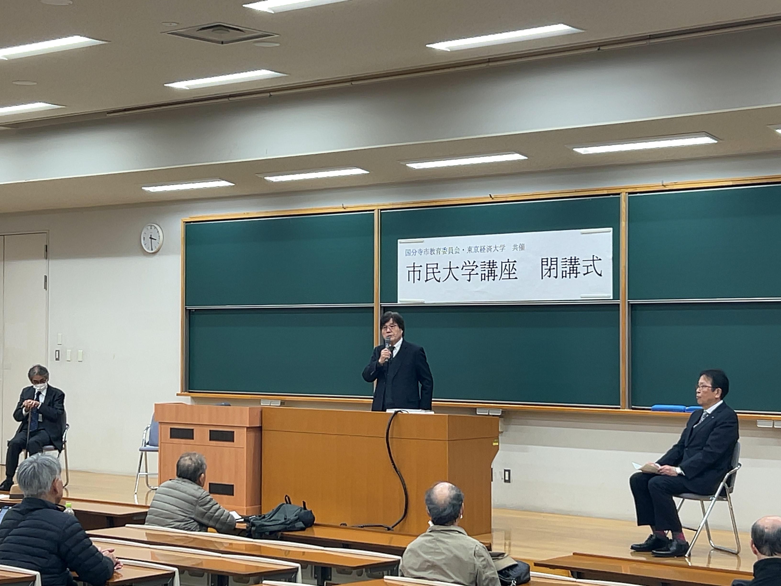 講義終了後、引き続き行われた閉講式には、古屋真宏 国分寺市教育委員会教育長、岡本英男 東京経済大学学長、加藤一彦 生涯学習推進委員会委員長が登壇しました。