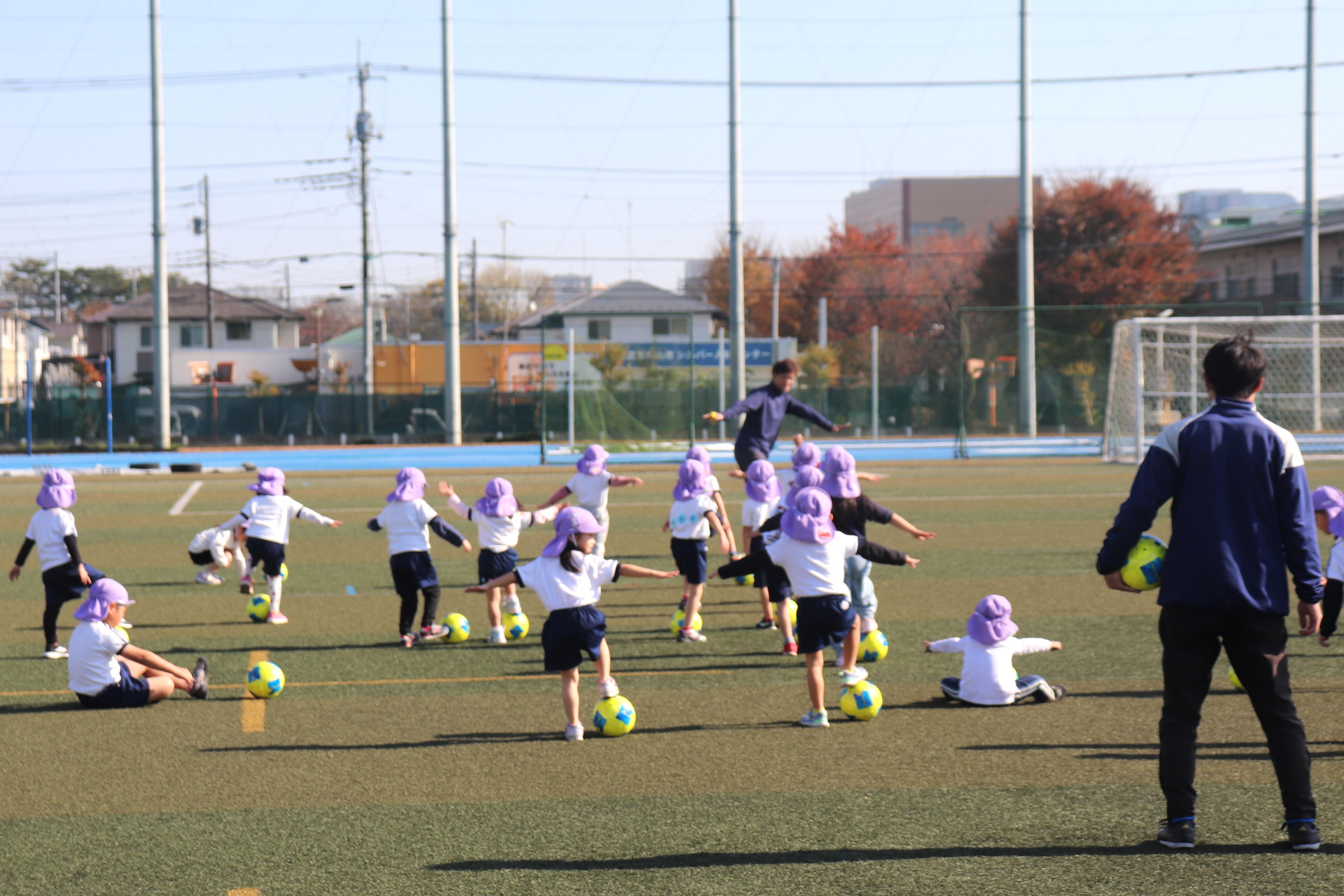 このサッカー教室は「学生の社会性向上」「武蔵村山キャンパスメイングラウンドの有効活用」「地域交流・貢献」を目的としており、当日はサッカー部の学生らが、みらい保育園の園児にサッカーを指導しました。
