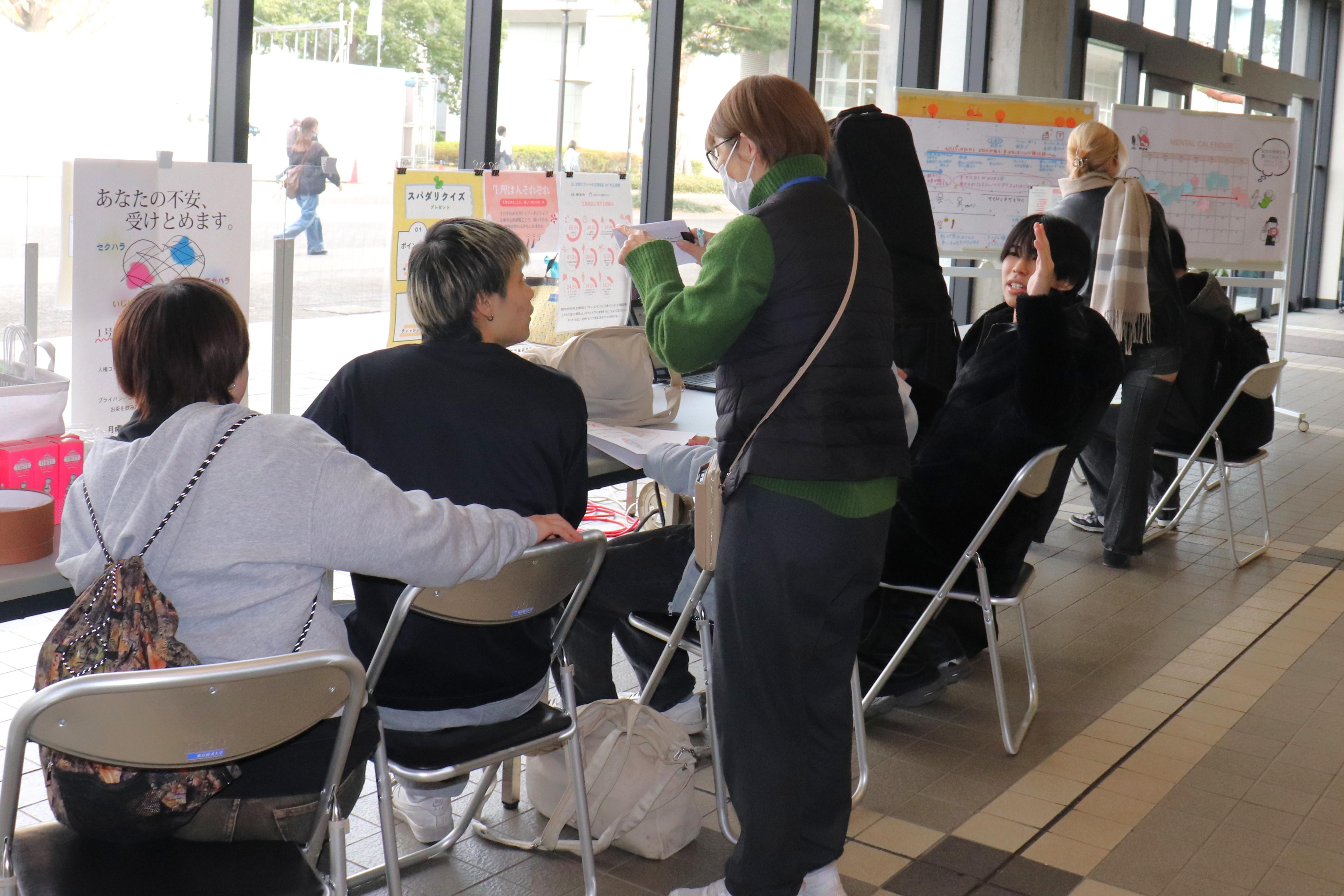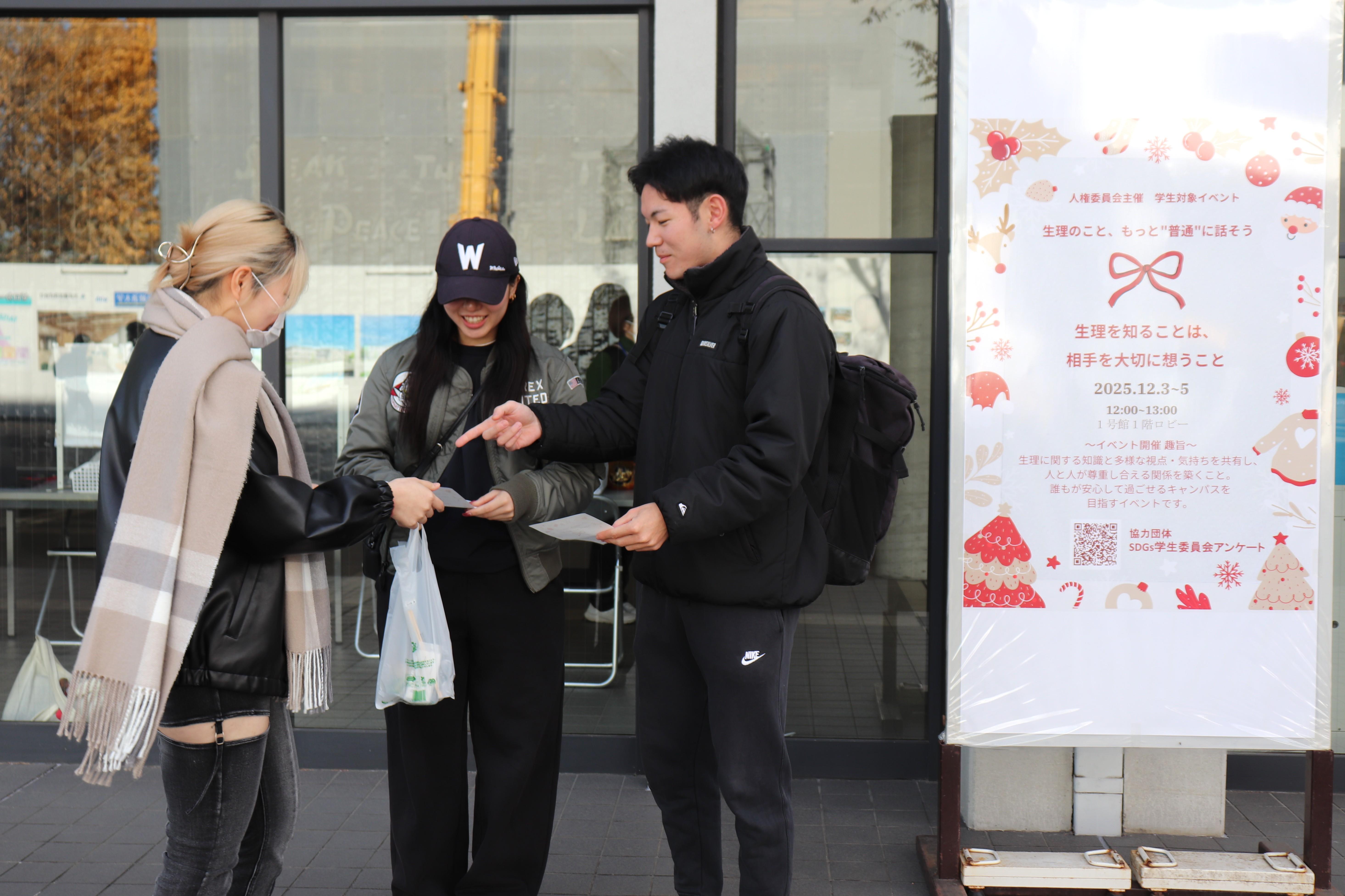 会場となった1号館1階ロビーでは、人権コーディネーターらが生理についての基礎知識や日常生活での困りごとなどをクイズ形式で紹介する中、男女問わず多くの学生が立ち寄り、楽しみながら生理への理解を深める姿がありました。