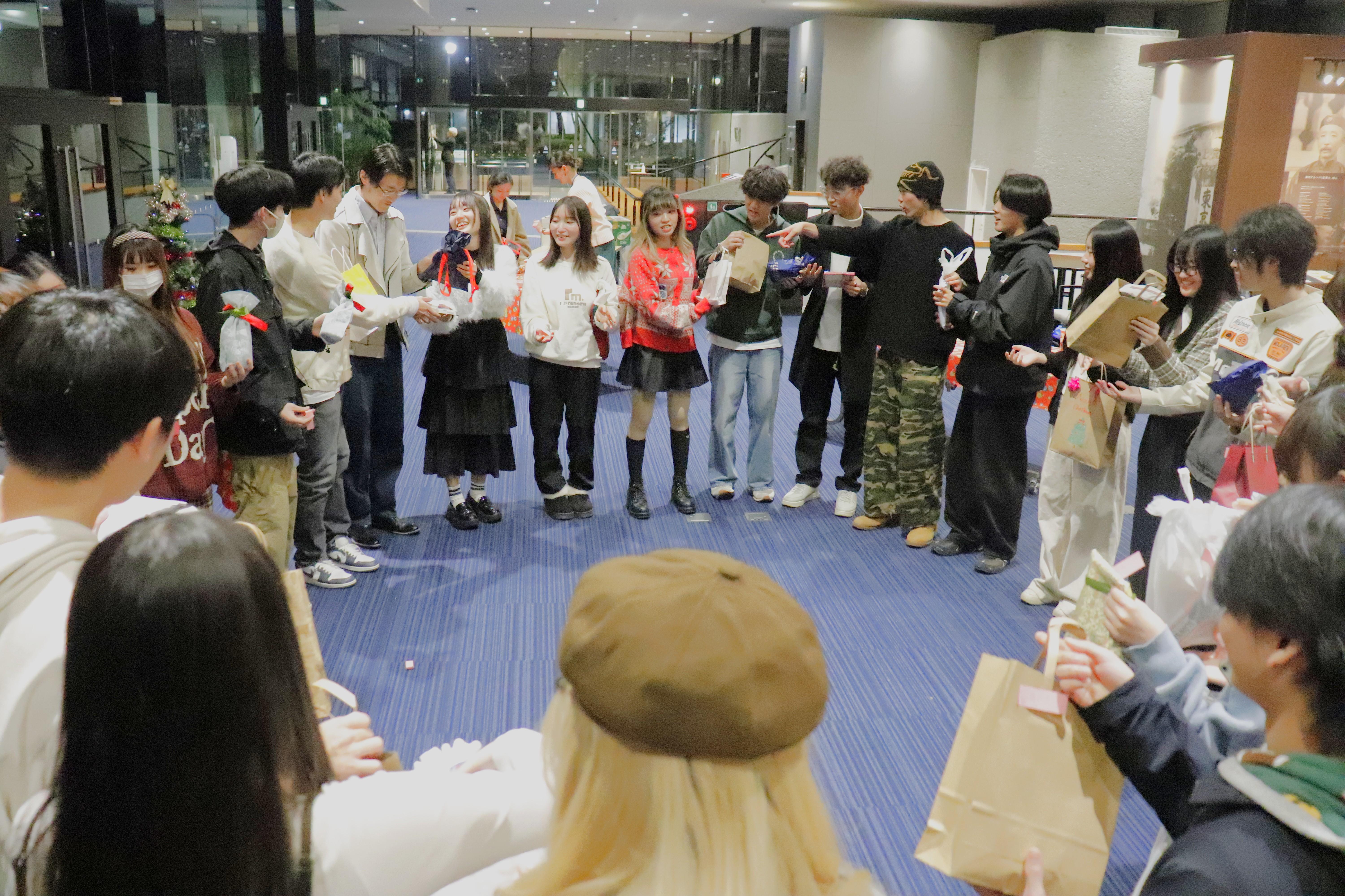 第三部ではプレゼント交換会が行われ、参加者らが輪になって持ち寄ったプレゼントを隣の人に渡していき、ストップがかかったタイミングで手にしていた人がプレゼントを受け取りました。各国のお菓子やプロテインなど個性あふれるプレゼントが用意され、会場はこの日一番の盛り上がりを見せました。
