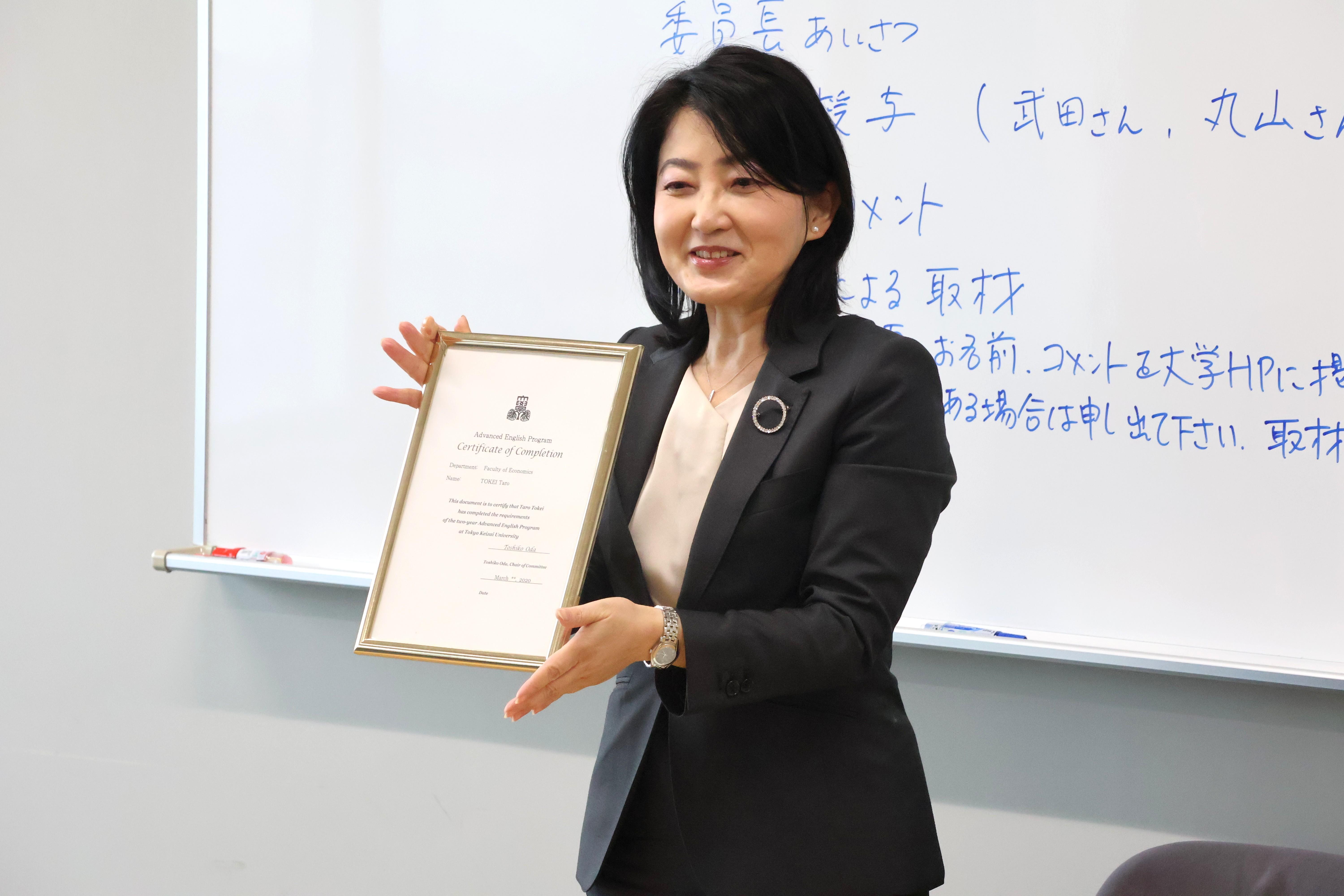 英語アドバンストプログラム運営委員長の小田 登志子 全学共通教育センター教授は「自分の専門の学びに加えて英語も使えることが強みになる。社会に出ても仕事と英語学習を両立してほしい」とエールを送りました。