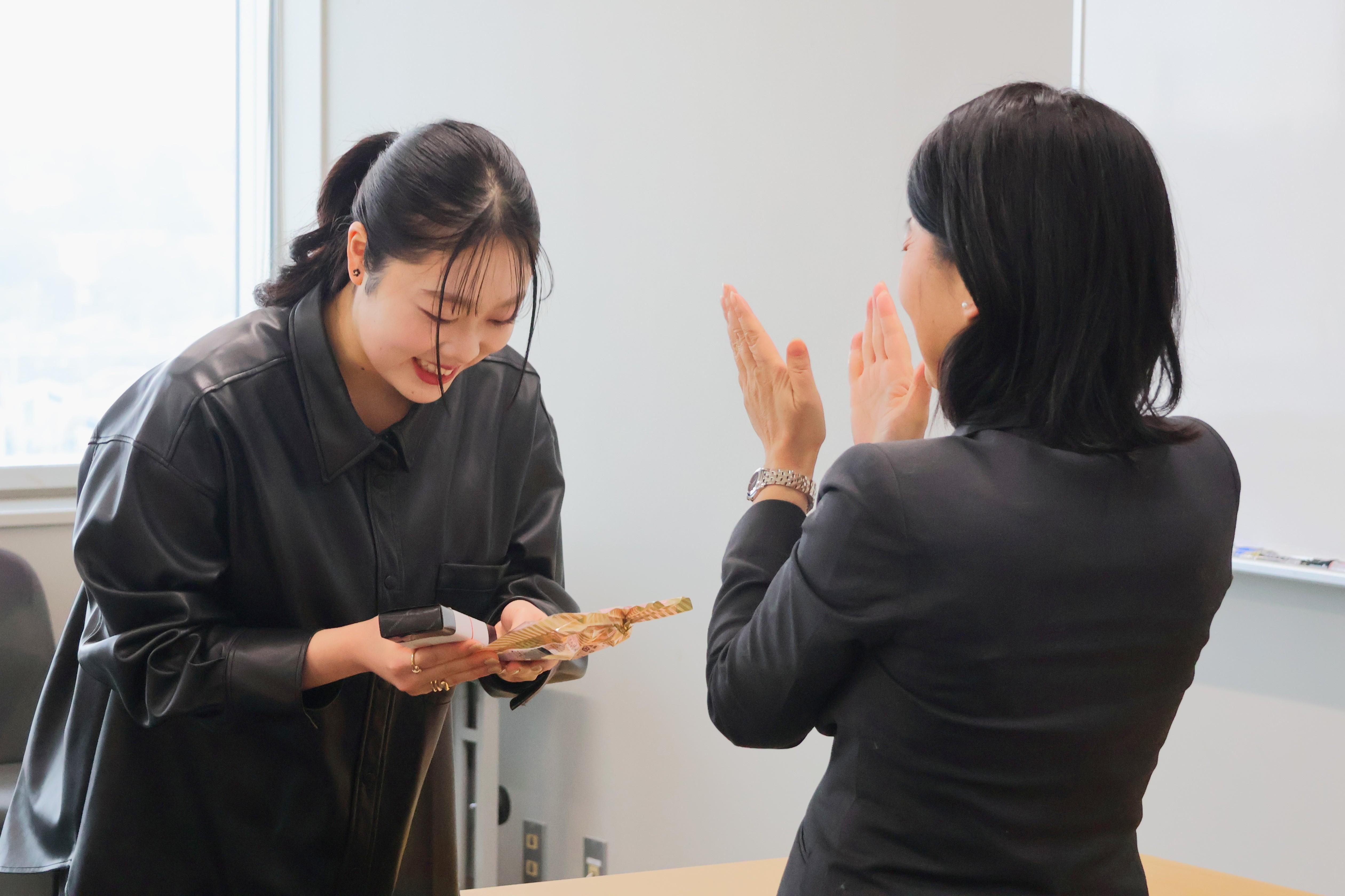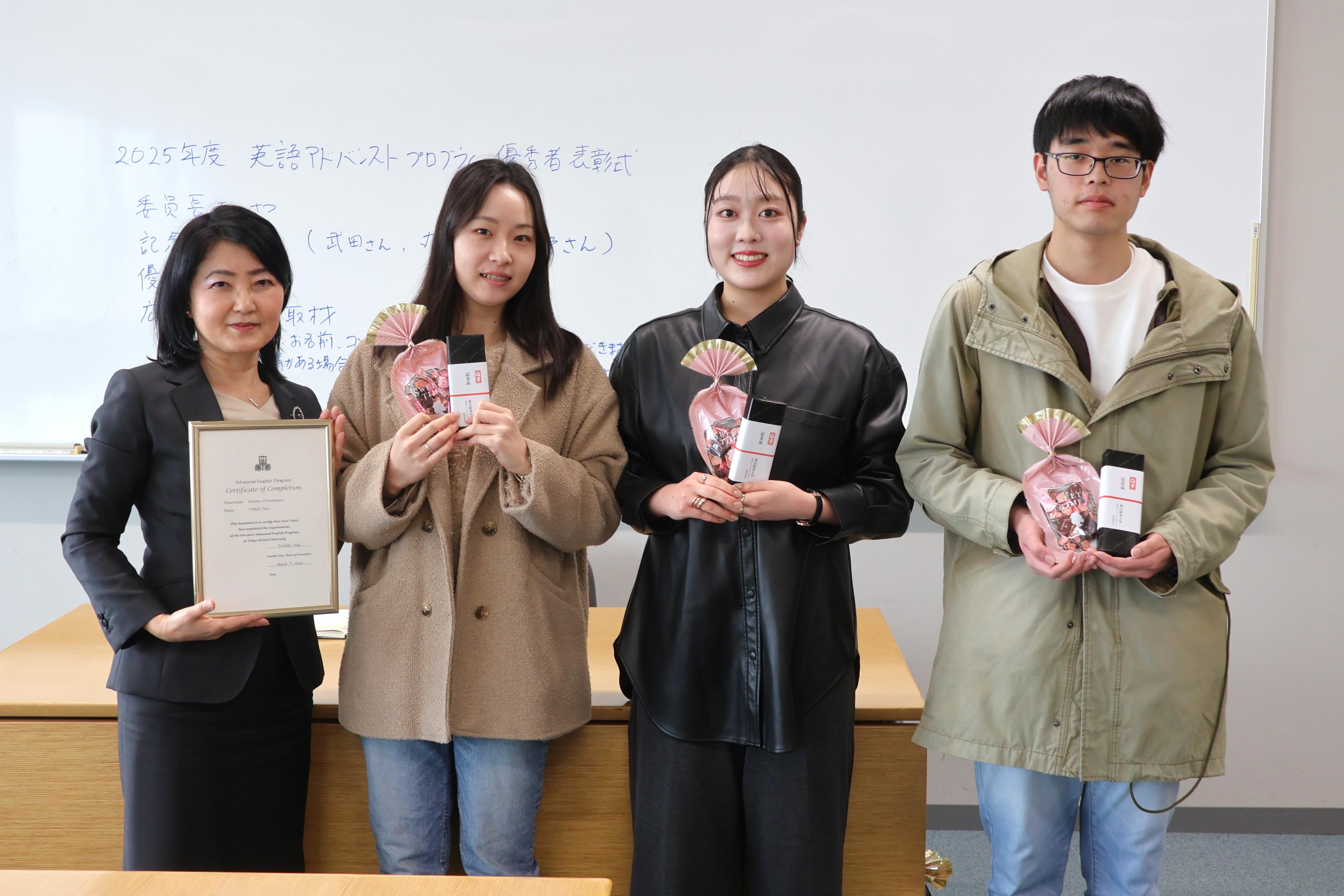 今回の表彰式は、プログラムを2年間継続履修し、優秀な成績を修めた学生4名が表彰され、記念品が贈呈されました。また、2年間で英語アドバンストプログラム科目から6単位以上を修得した学生には、プログラム修了証も授与されます。