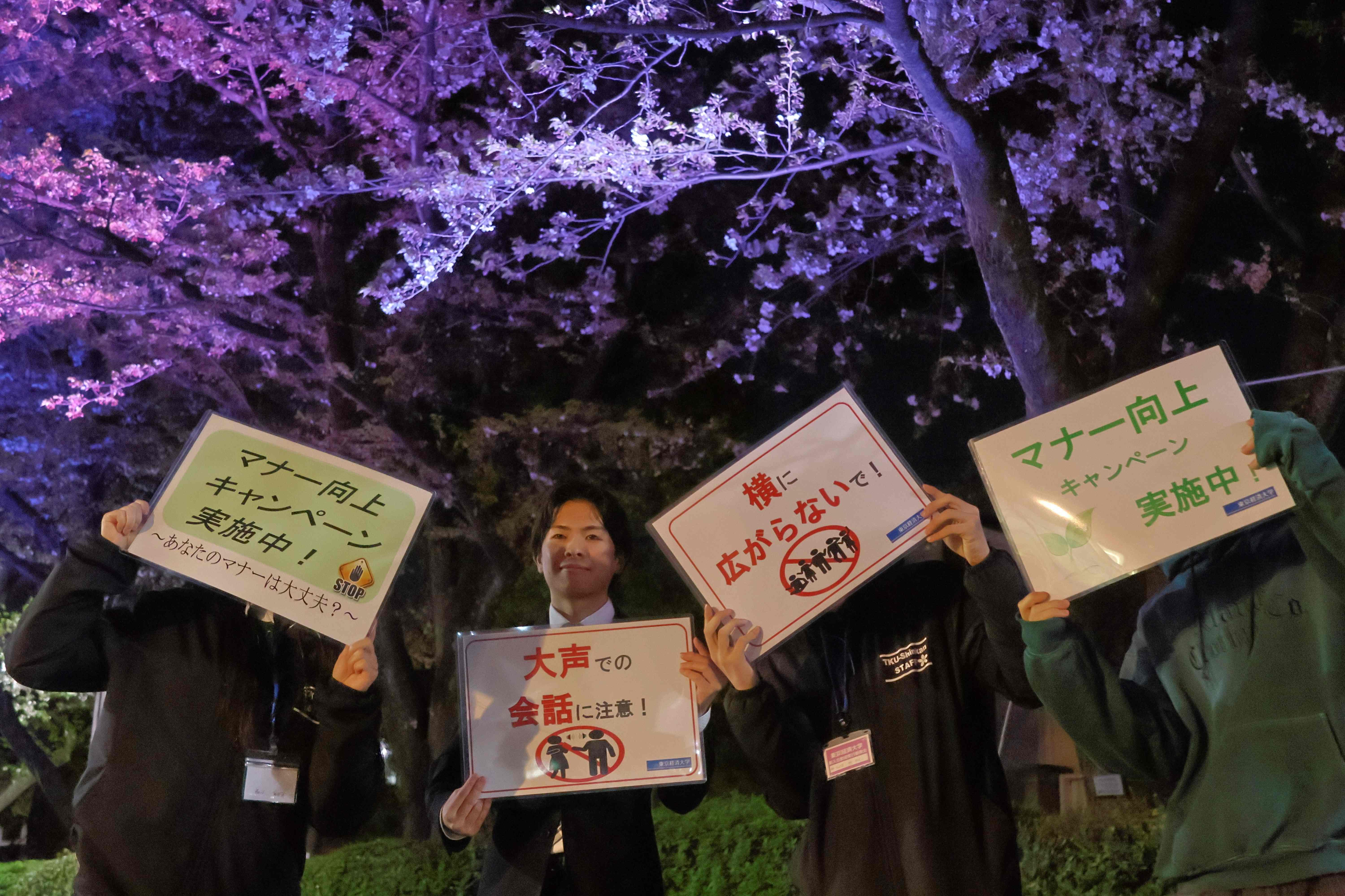 この活動は、学生が主体となってより良い通学環境をつくるために昨年度から継続しているもので、今回は、大学生活をスタートさせたばかりの新1年生を対象に、クラス懇親会後の下校時間に合わせて実施されました。