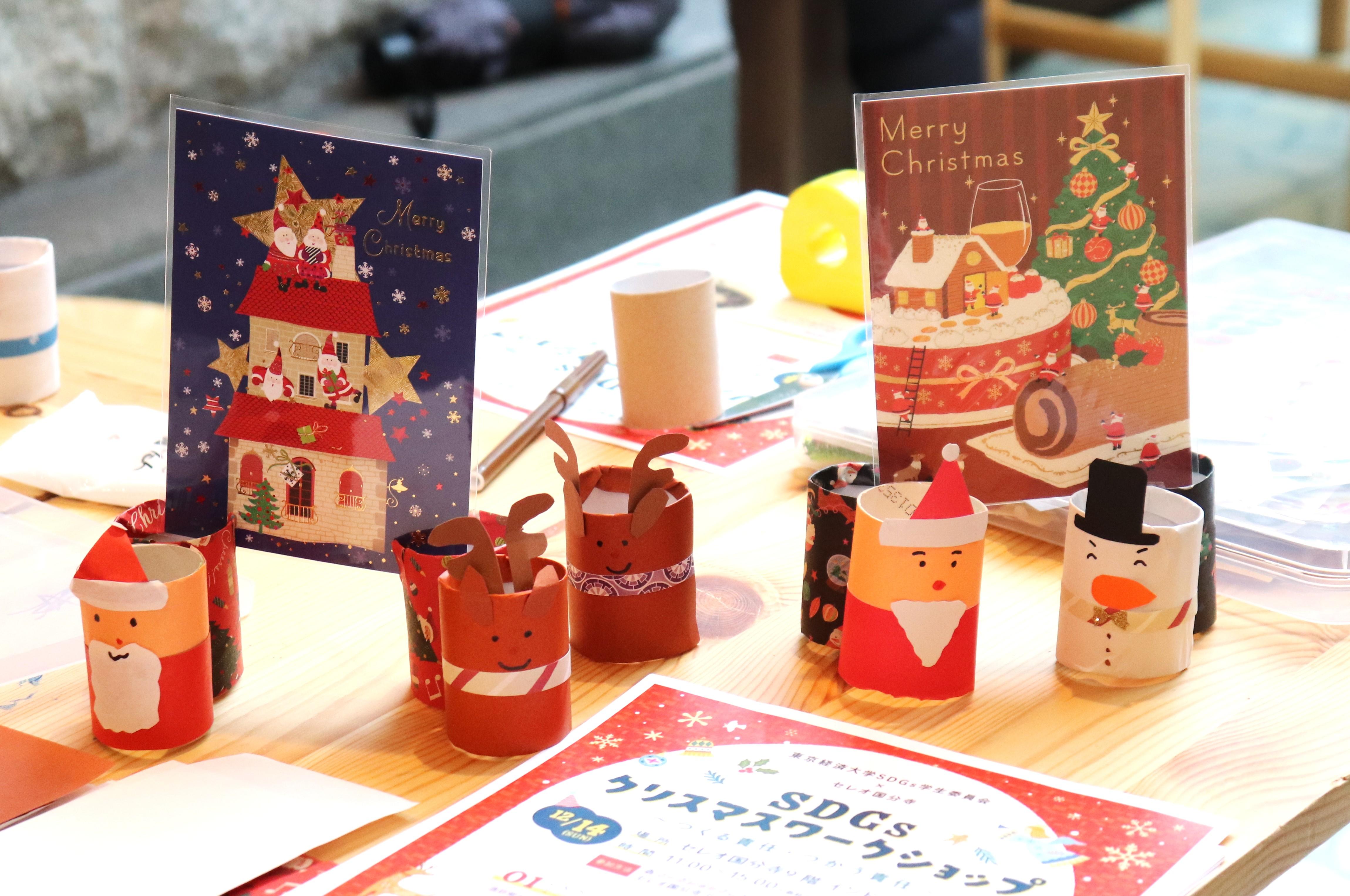 リース作りでは、国分寺の地場野菜「こくベジ」あるいは、大学で収穫したサツマイモのツルに、リボンや大学で採取したどんぐりなどを飾り付け、カードスタンド作りでは、トイレペーパーの芯に折り紙を巻き、サンタクロースやトナカイ、雪だるまを作っていました。