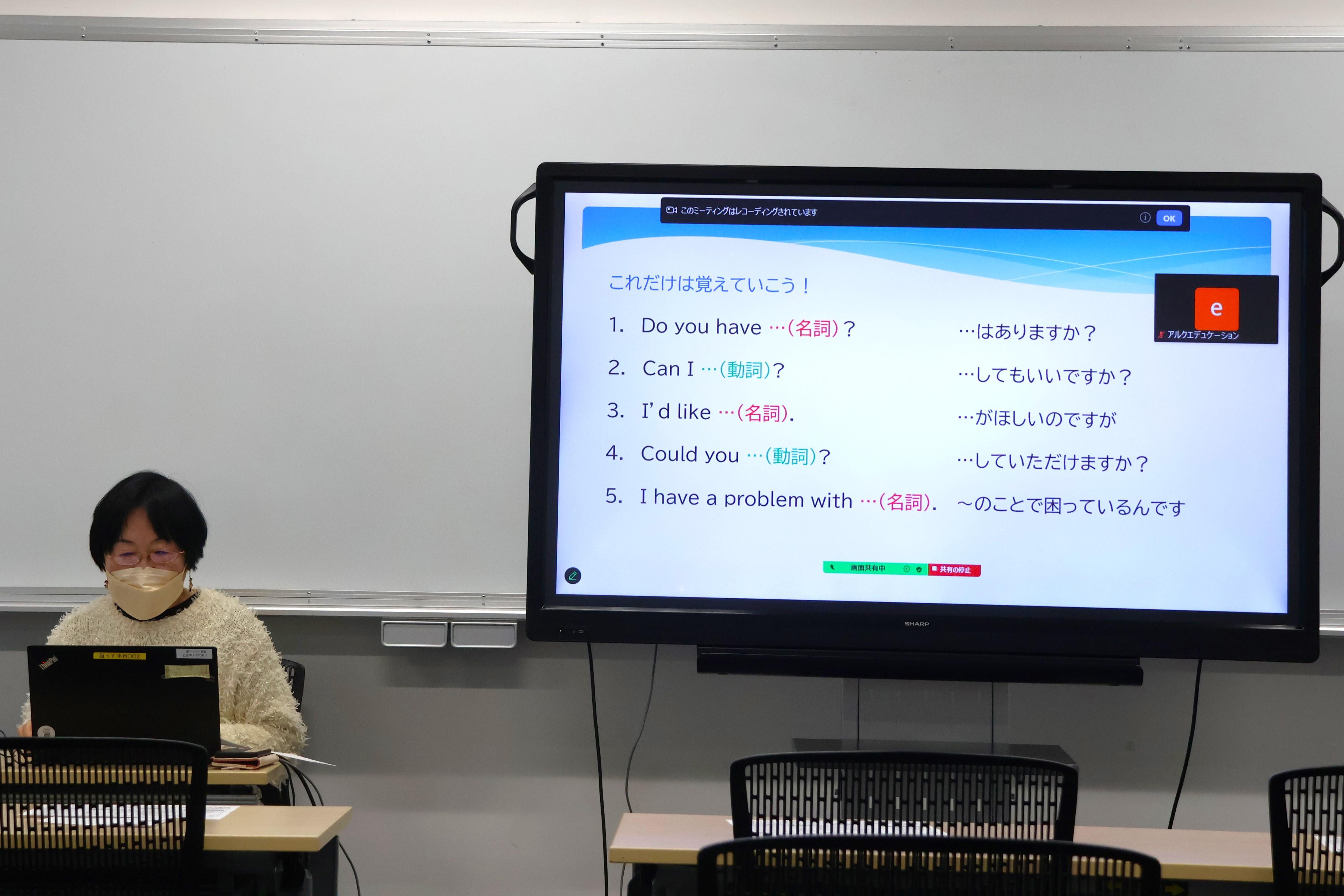 「バーチャルな海外旅行をしてみましょう」という掛け声を手始めに、英語でコミュニケーションを取る際のコツや、日本国内でも外国人との会話を盛り上げるための具体的なフレーズなどを解説し、参加した学生は発音練習を行いました。