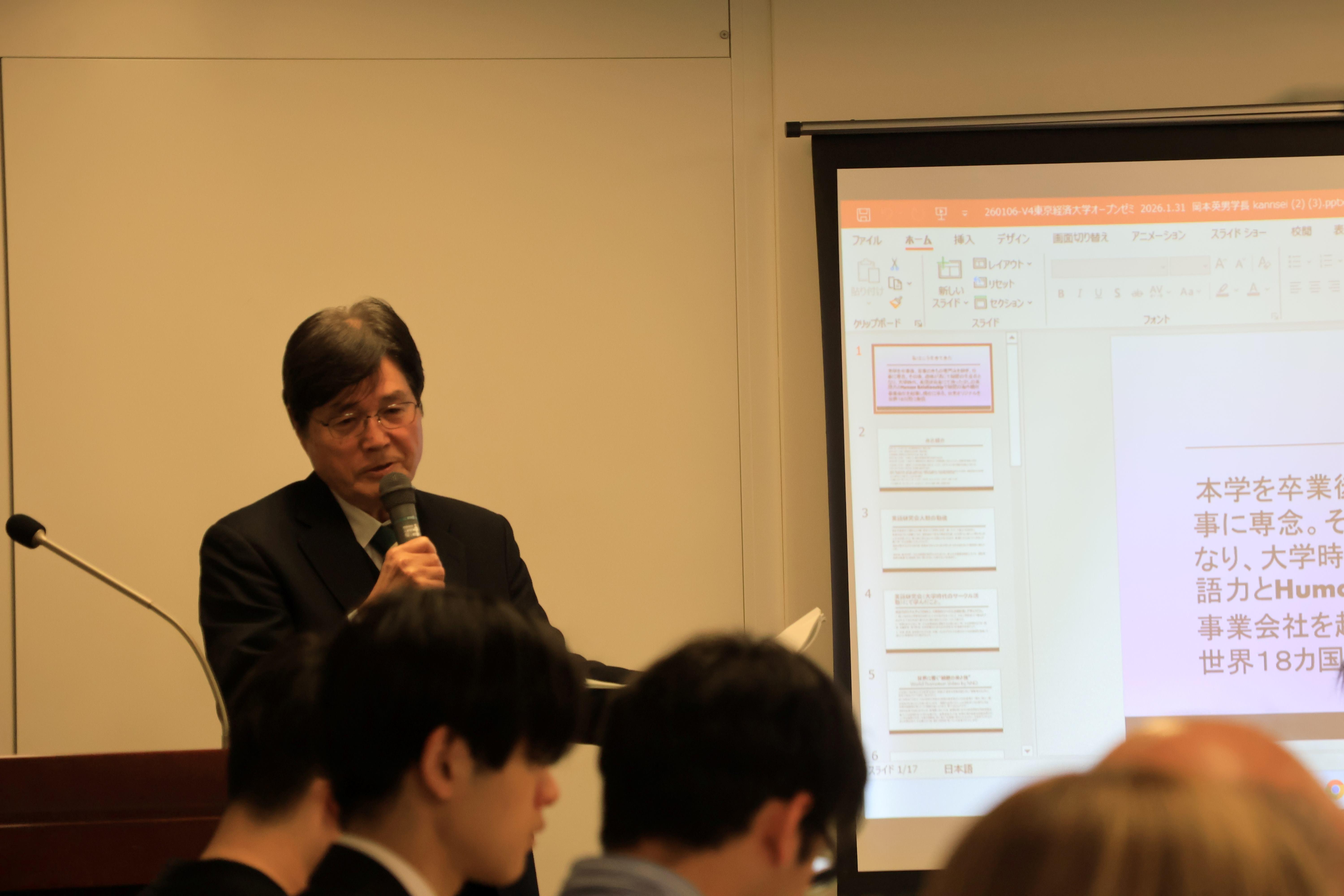 東京経済大学の岡本英男学長は2026年1月31日(土)、国分寺キャンパス大倉喜八郎 進一層館地下1階会議室で、第4回オープンゼミ「君たちはどう生きるか」を開催しました。当日は当日は在学生、卒業生、高校生、市民ら約80名が参加しました。
