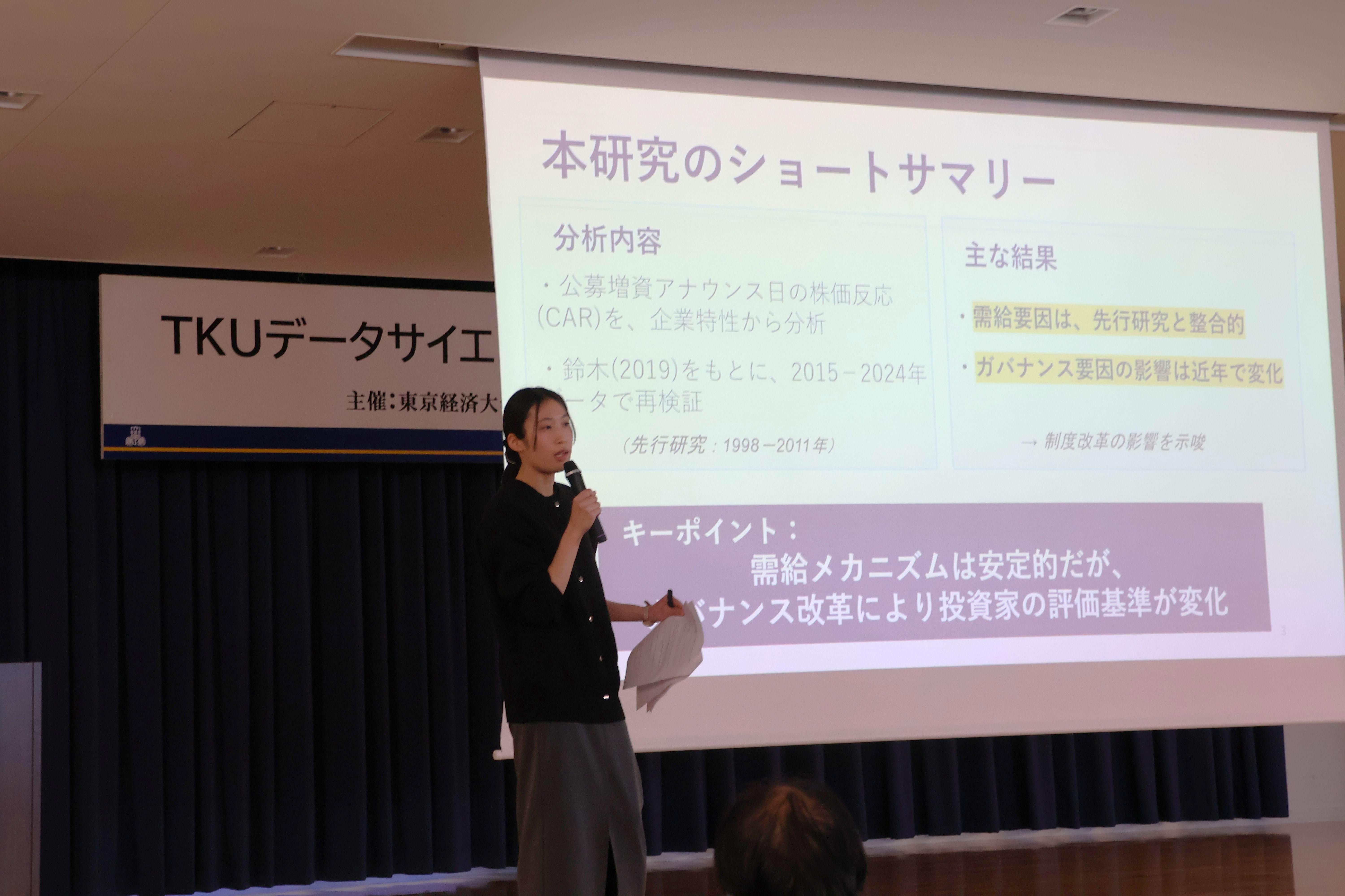 星野朱美さん(経済3年)は、『公募増資のアナウンスメント効果』をテーマに個人で発表を行い、プログラミング言語の一つであるPythonを駆使して分析したことについて、会場からその選定理由などの質問が寄せられました。