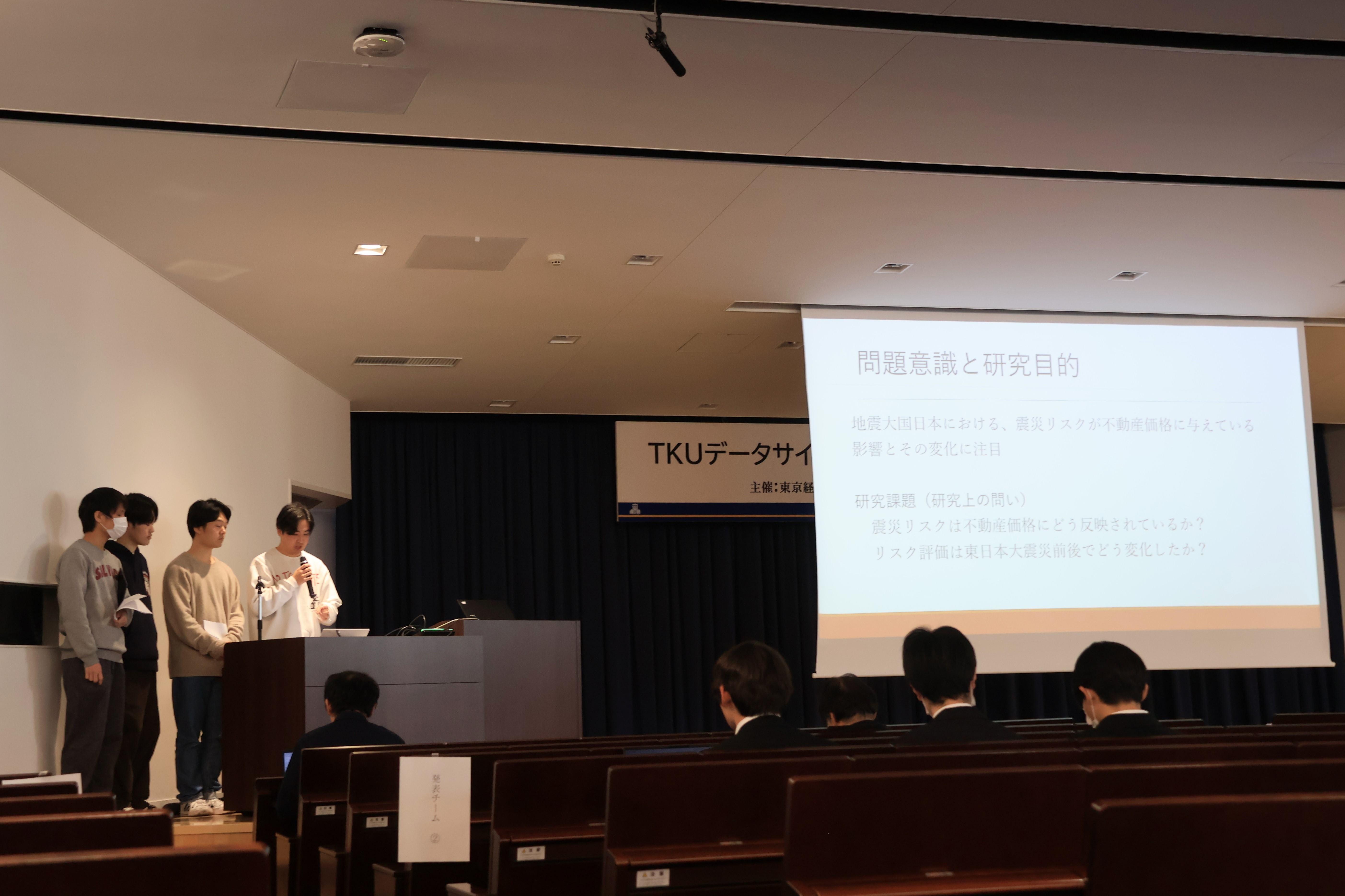 3番手として登場した「日本経済実証ゼミ」グループは、『災害リスクはマンション価格にどう反映されているか―東京都中古マンション価格の長期ヘドニック分析―』をテーマに、日本国内の約27万件の中古マンション取引価格と、東京都内の約5千カ所の地域危険度測定調査を元にデータを可視化し、緻密な分析を行いました。
