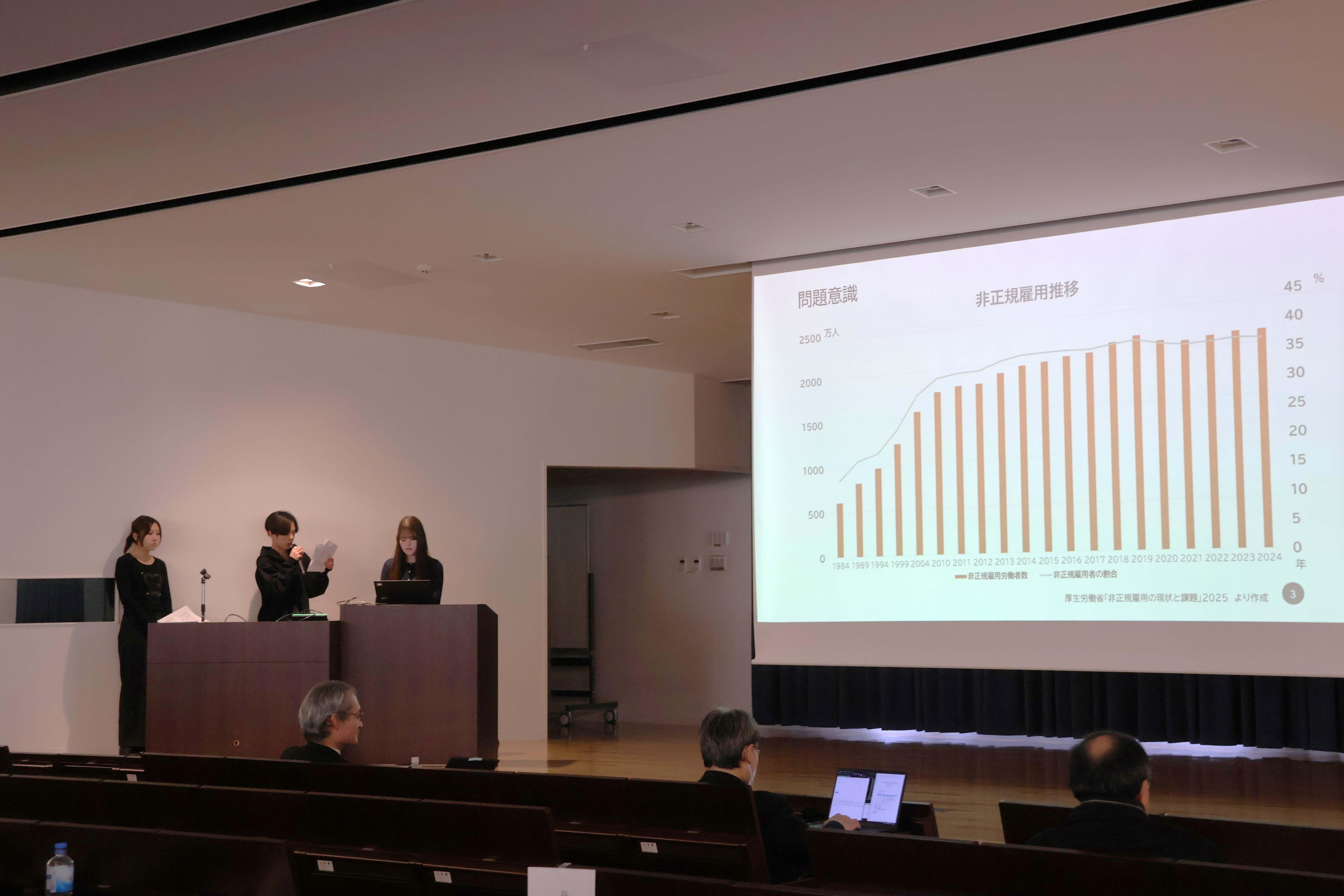 最後に登壇した「安田宏樹ゼミナールBグループ」は、『雇用形態が幸福度に与える影響』をテーマに発表を行いました。