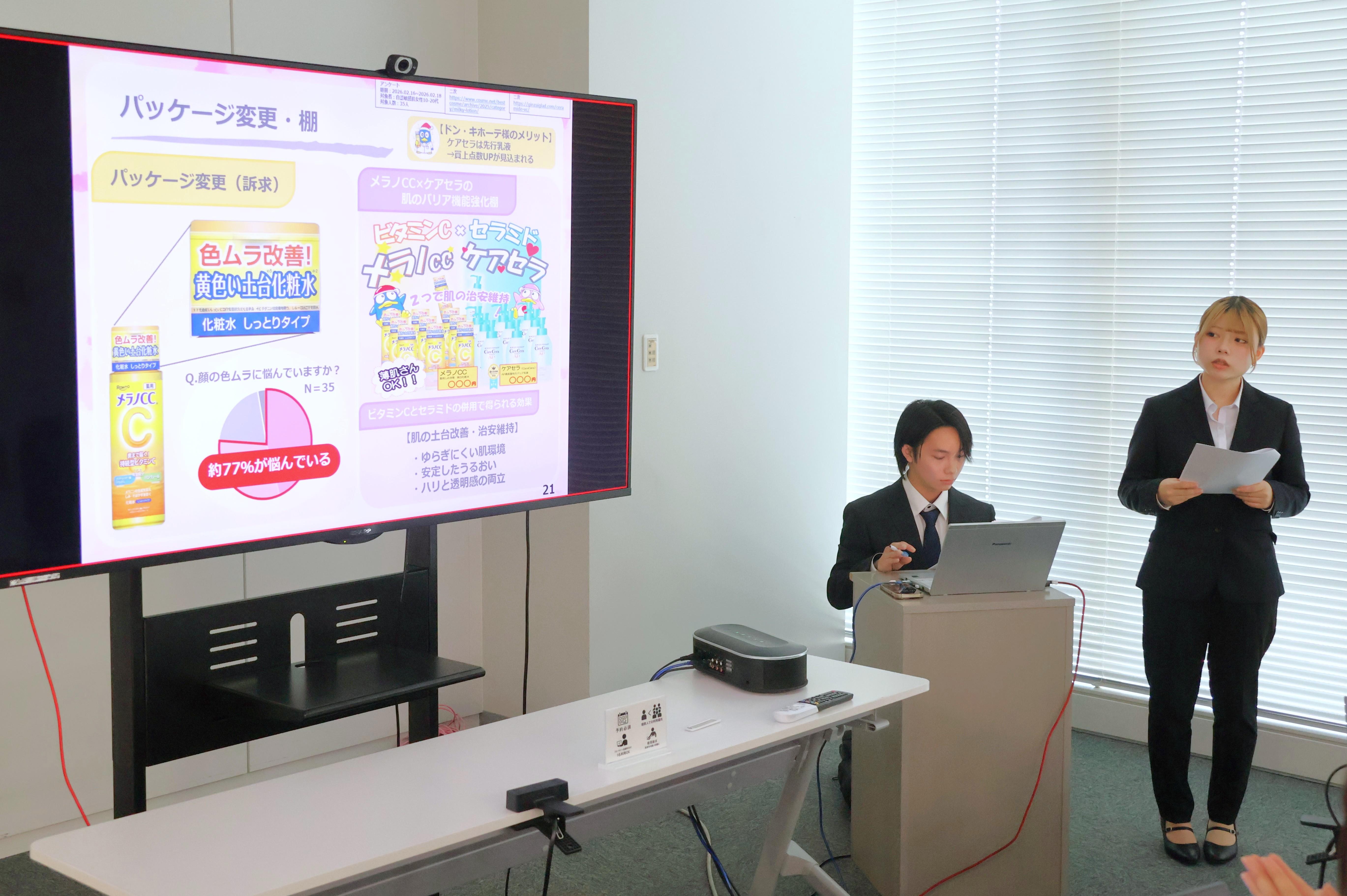 今回は『メラノCCの若年層顧客接点開発』をテーマに、4つのチームがドン・キホーテにおけるプロモーションを企画するというもので、ゼミ生らは実際の販売データやアンケート調査をもとに商品の購買状況を分析したうえで、独自の視点で若者向けの顧客開発手法を提案しました。