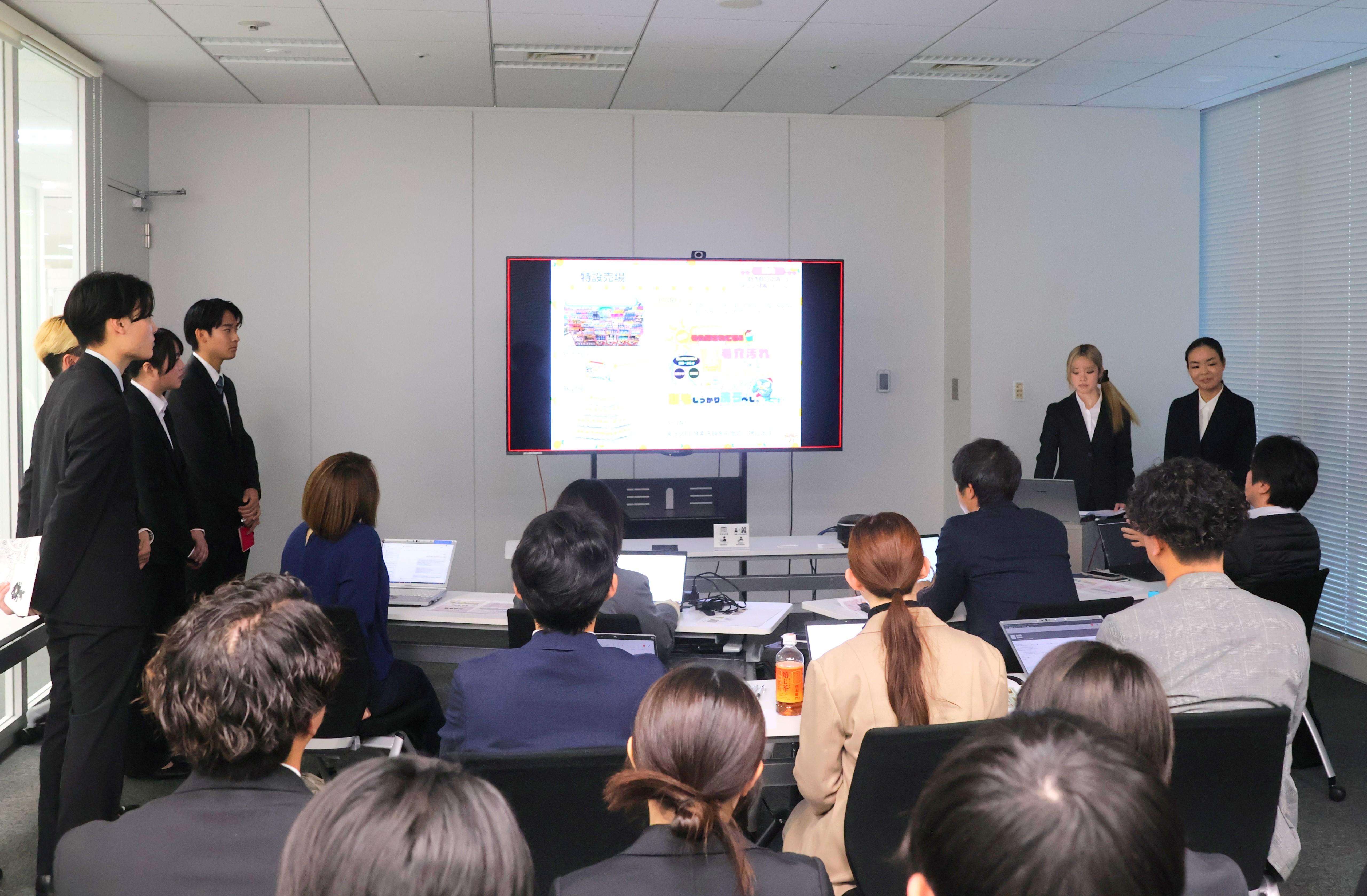 購買データの分析を通じて商品のブランディングやプロモーション企画を研究している経営学部の本藤貴康ゼミは2026年2月19日(木)、ロート製薬東京支社(東京・港区)で同社のスキンケアブランド「メラノCC」を若年層へ訴求するための販売促進策をロート製薬と大手小売店ドン・キホーテの関係者にプレゼンテーションしました。
