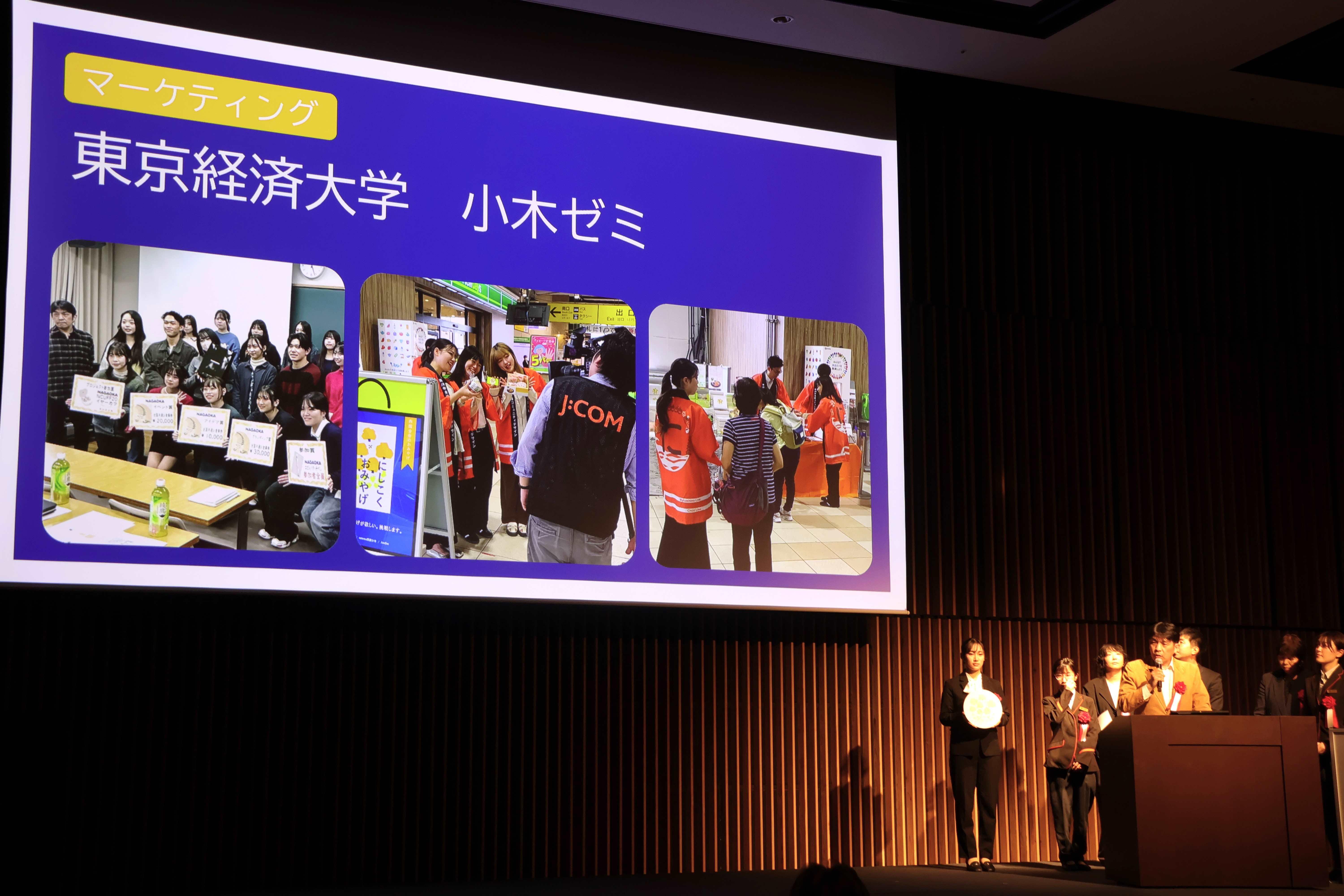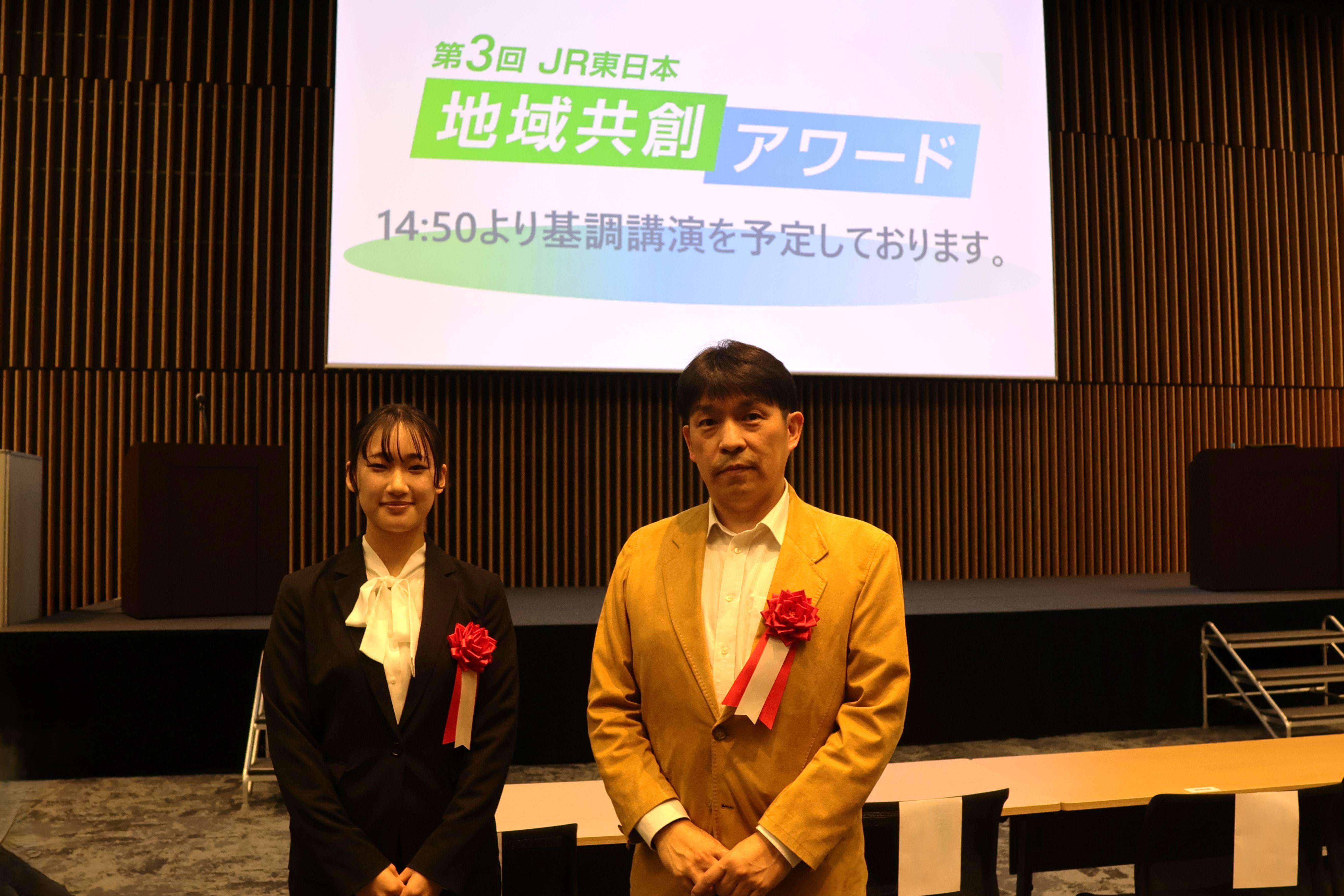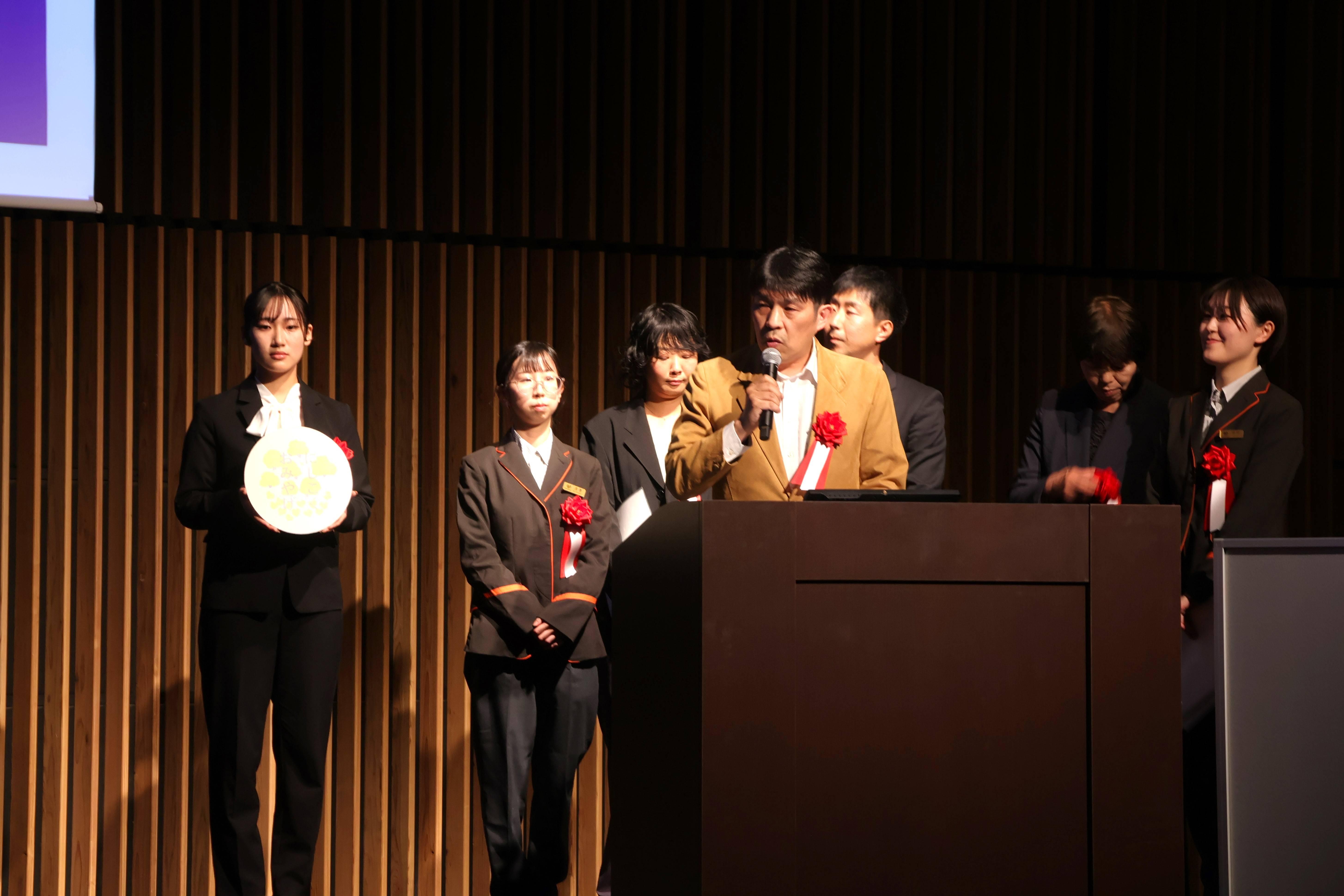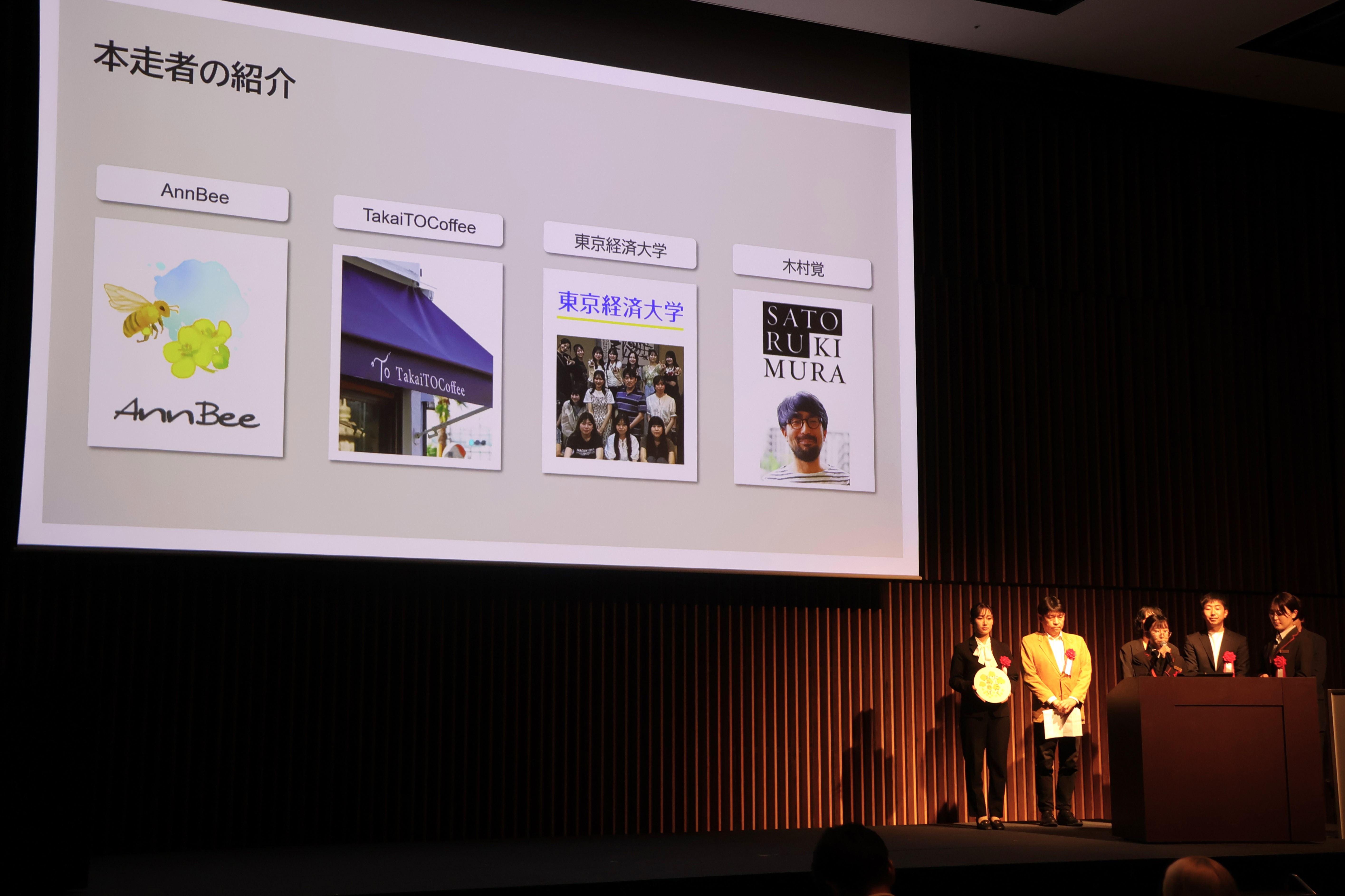 高輪ゲートウェイ駅前で開催されたアワードの最終選考会には、小木教授とともにゼミ生を代表して飯塚心夢さん(経営4年)が参加しました。壇上で小木教授と本走者の各代表者がこれまでの活動の歩みと成果をプレゼンテーションを行い、飯塚さんもプロジェクトの一員として登壇しました。結果、西国分寺の地域資源を活かした共創の物語が、審査員から高く評価されました。