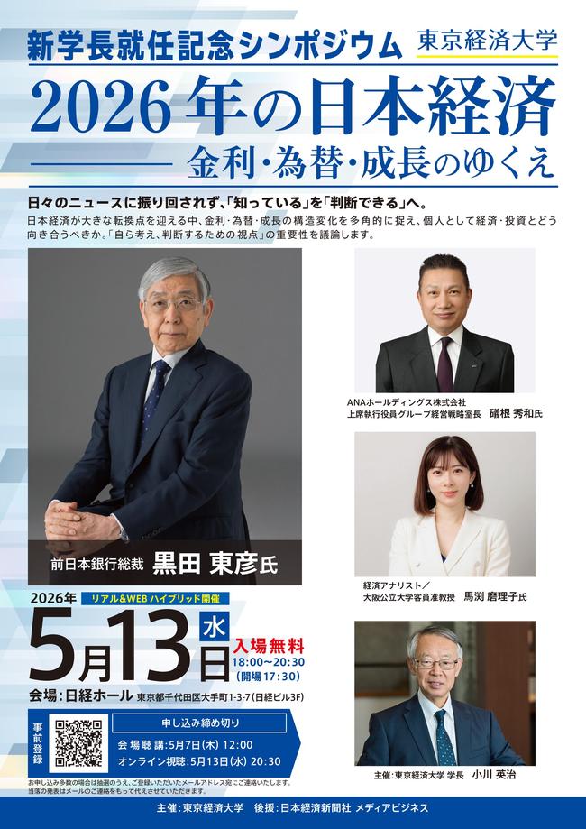 東京経済大学(東京・国分寺市)は、2026年5月13日(水)、小川英治学長の就任を記念したシンポジウム「2026年の日本経済 ―金利・為替・成長のゆくえ―」を、日経ホール(東京・千代田区)で開催します。